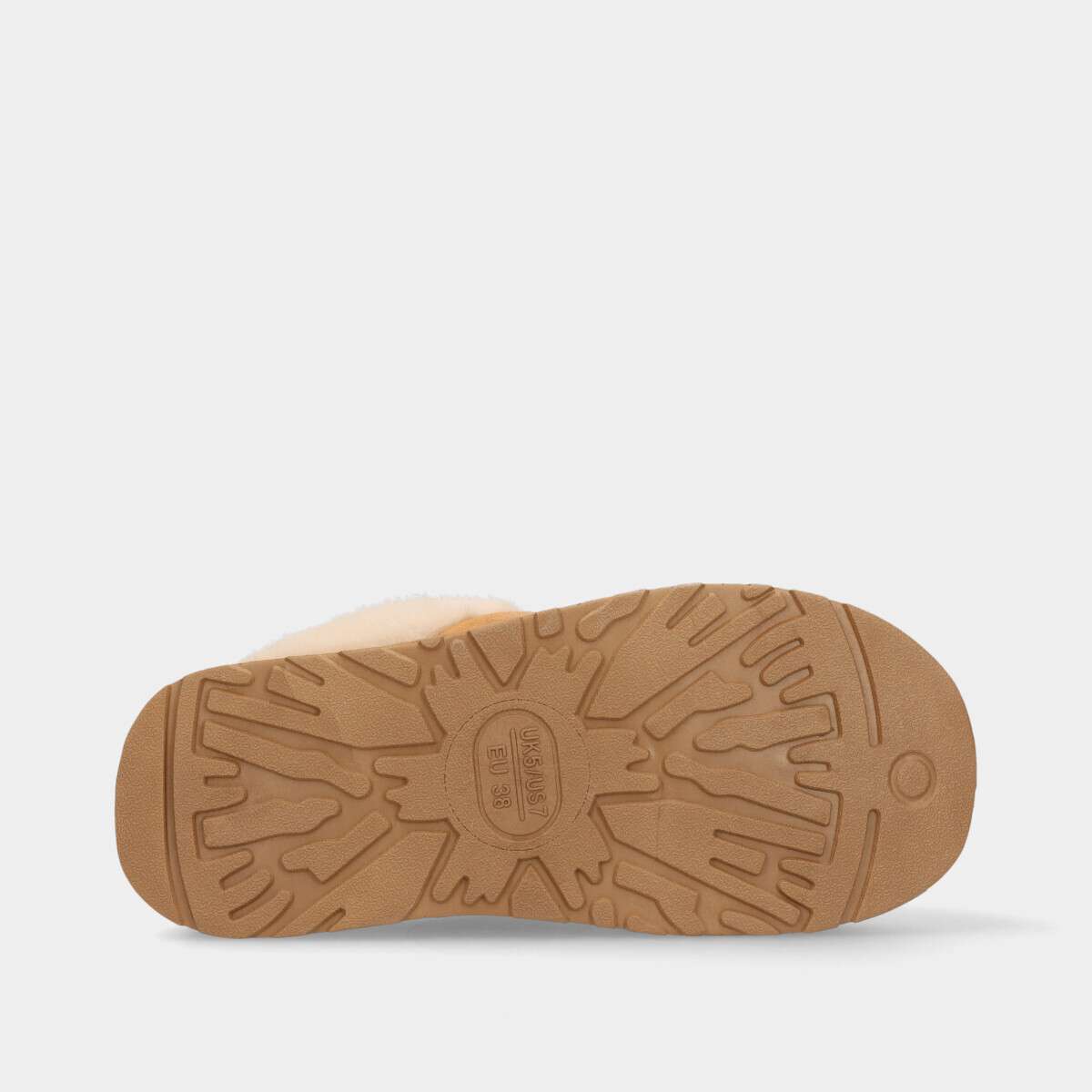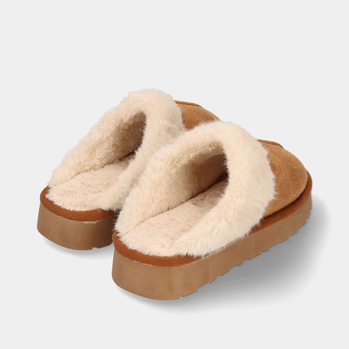 Chinelo para casa ou exterior na cor camel, gola e forro de pelo.