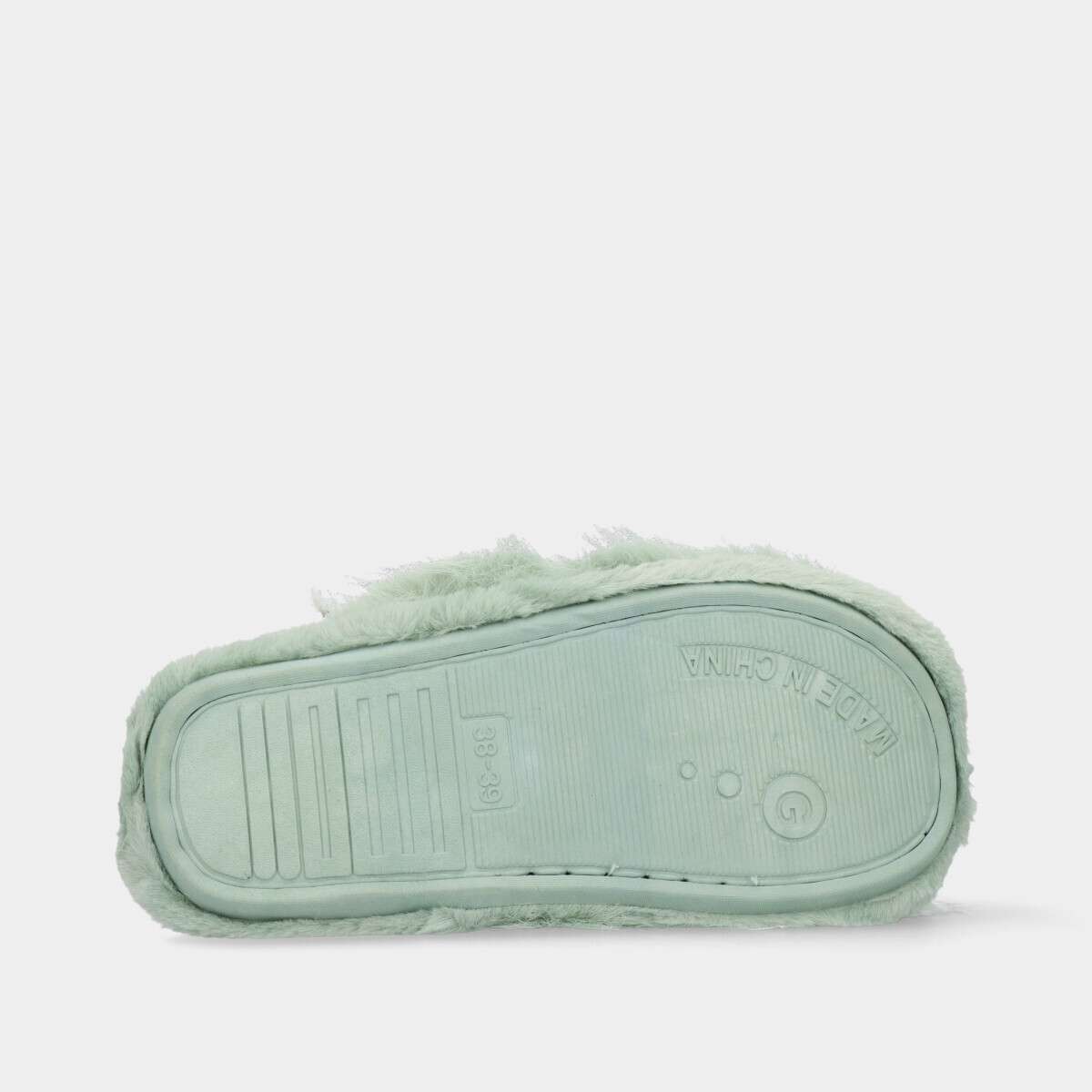 Chinelo todo em pelo na cor verde com sola de borracha.