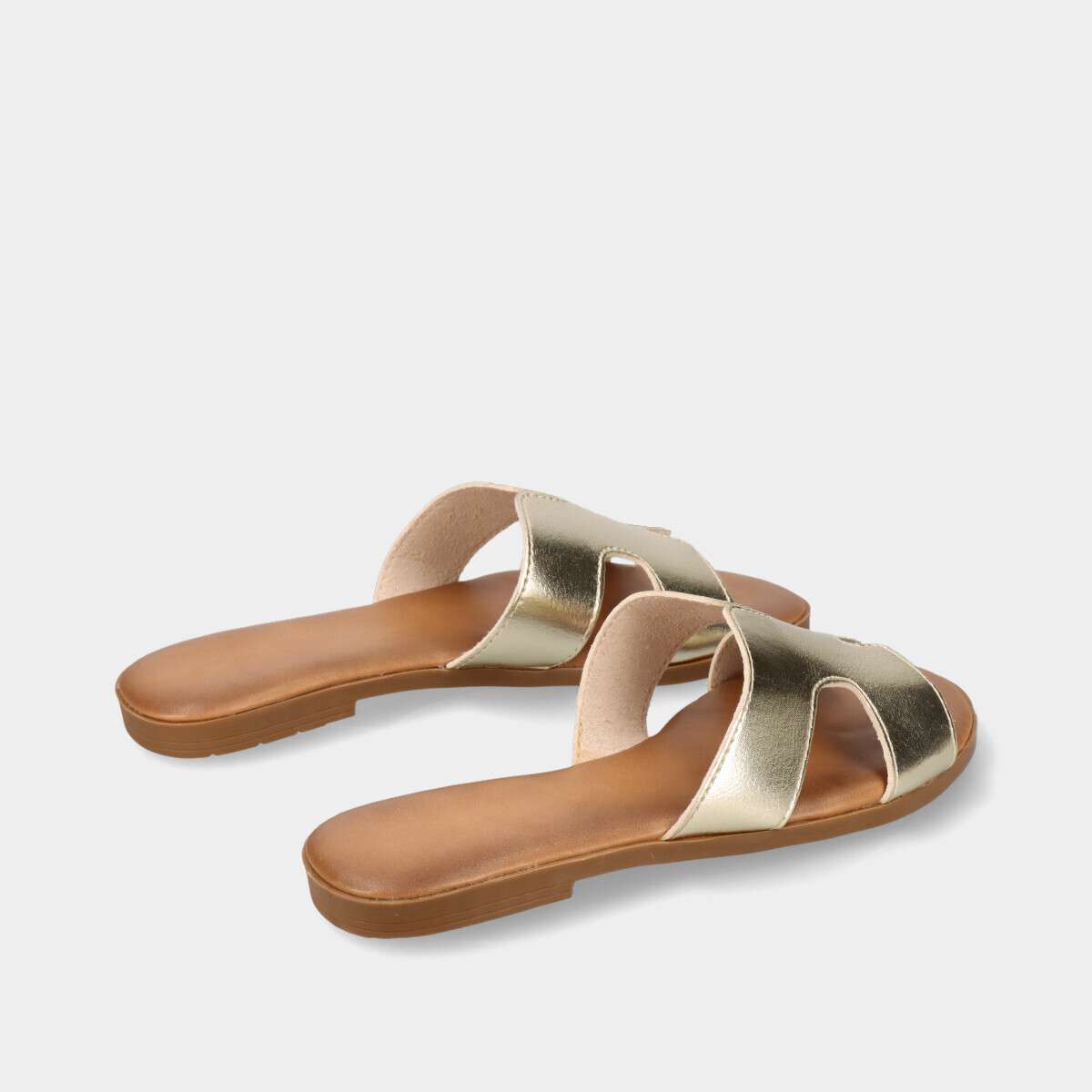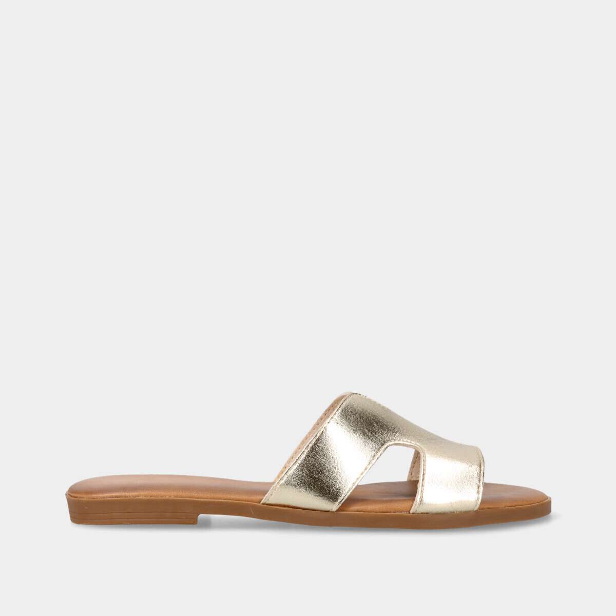 Chinelo raso para mulher em dourado, com tira larga sobre o peito do pé recortada em forma geométrica. Ideal para dias quentes, combina elegância e conforto.