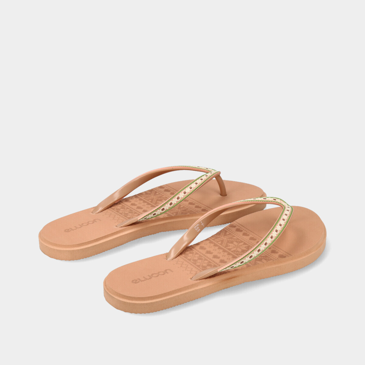 Chinelos de dedo salmão com detalhes para mulher, leves e confortáveis. Um modelo prático e versátil, ideal para praia, piscina e uso diário no verão, garantindo conforto e facilidade em cada utilização.