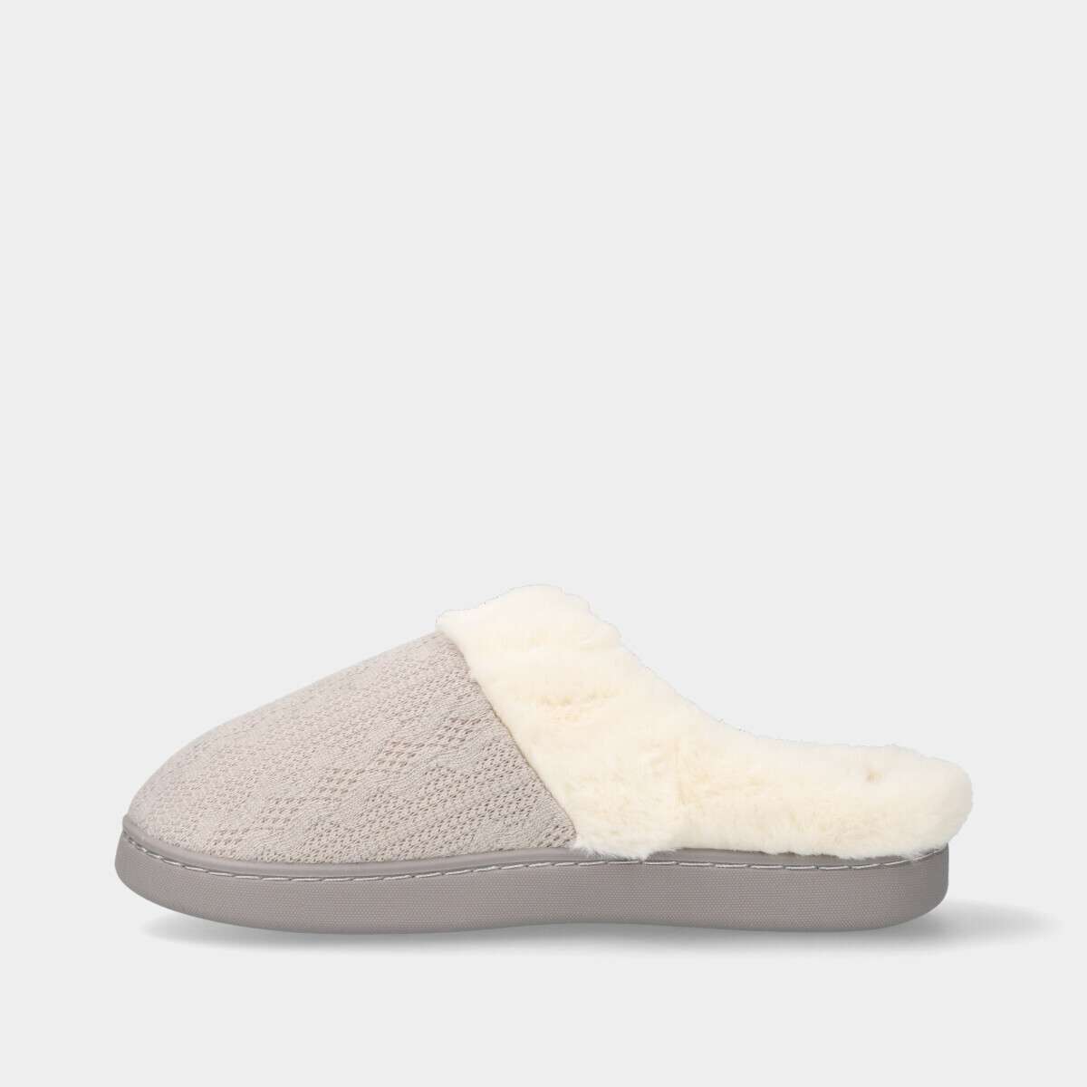 Chinelo confortável na cor cinza com gola e forro de pelo quente e sola de borracha.