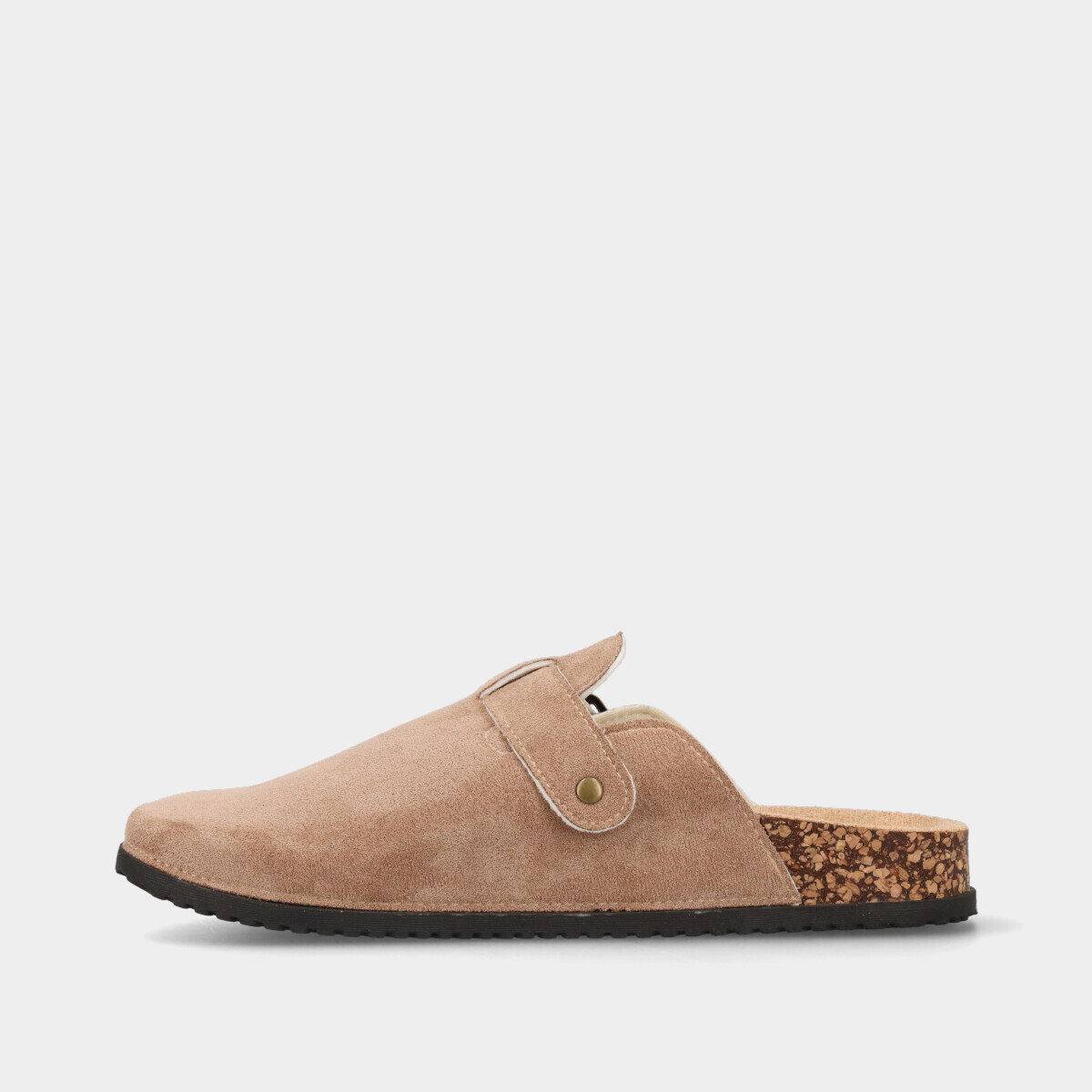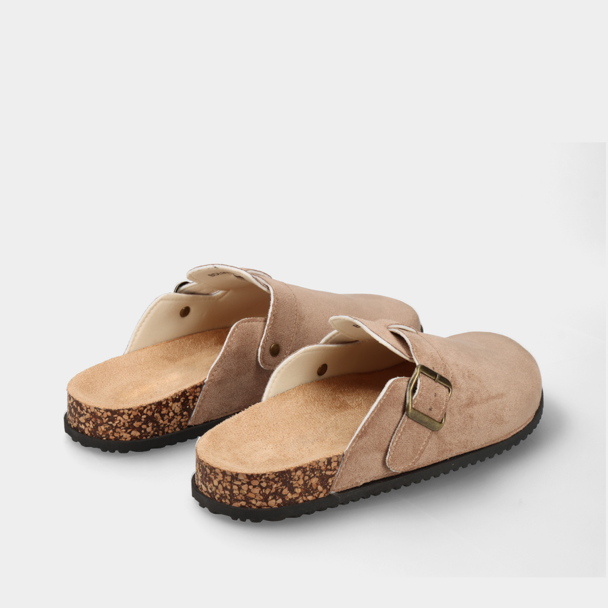 Soca anatómica em taupe para mulher, com fivela dourada ajustável. Conforto e estilo para o dia a dia, combinando praticidade e elegância.