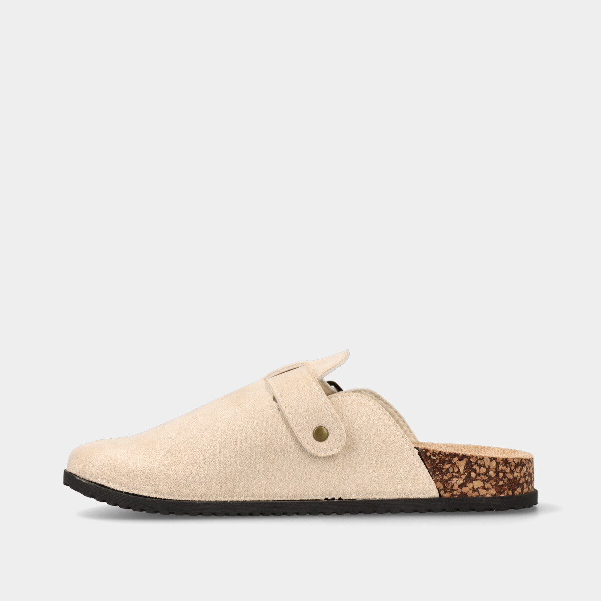 Soca anatómica em bege para mulher, com fivela dourada ajustável. Conforto e estilo para o dia a dia, combinando praticidade e elegância.