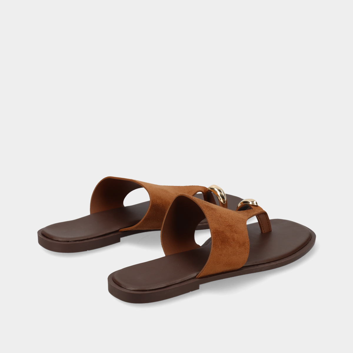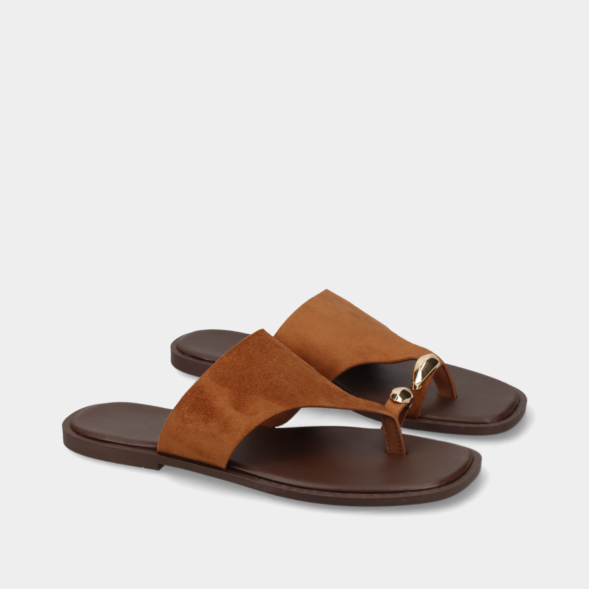 Chinelos de dedo camel para mulher com aplicação dourada, tira larga no peito do pé e sola flexível. Modelo leve e confortável, ideal para o verão, combinando um estilo moderno, minimalista e elegante.