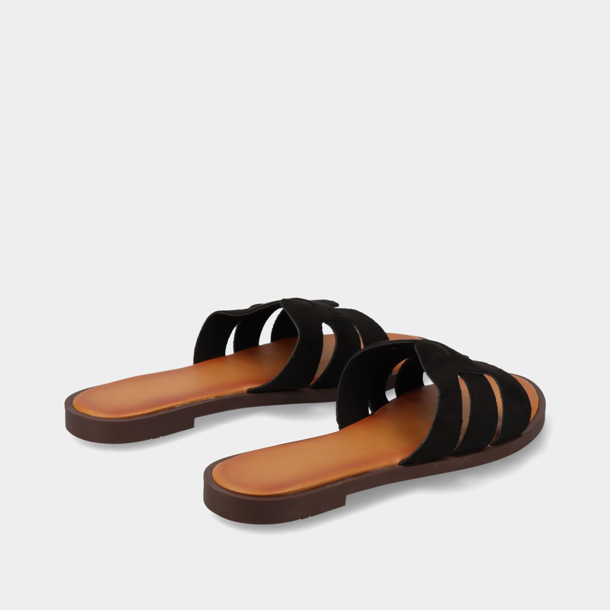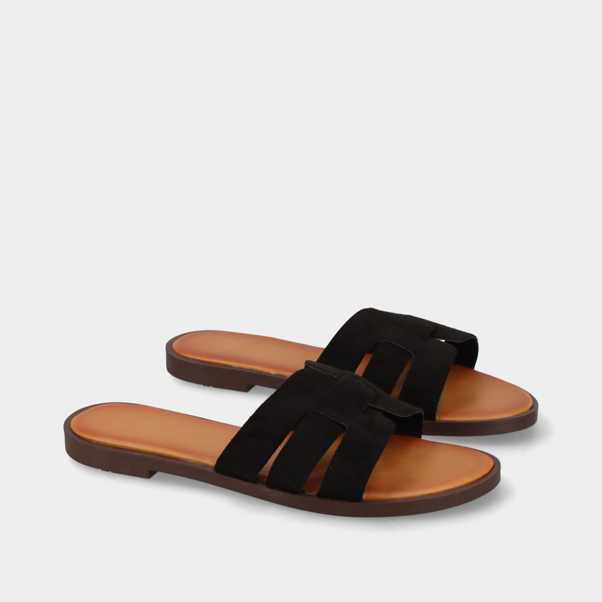 Chinelos rasos pretos para mulher com efeito camurça e pala recortada. Modelo leve e confortável, ideal para o verão, combinando um estilo moderno, minimalista e elegante.