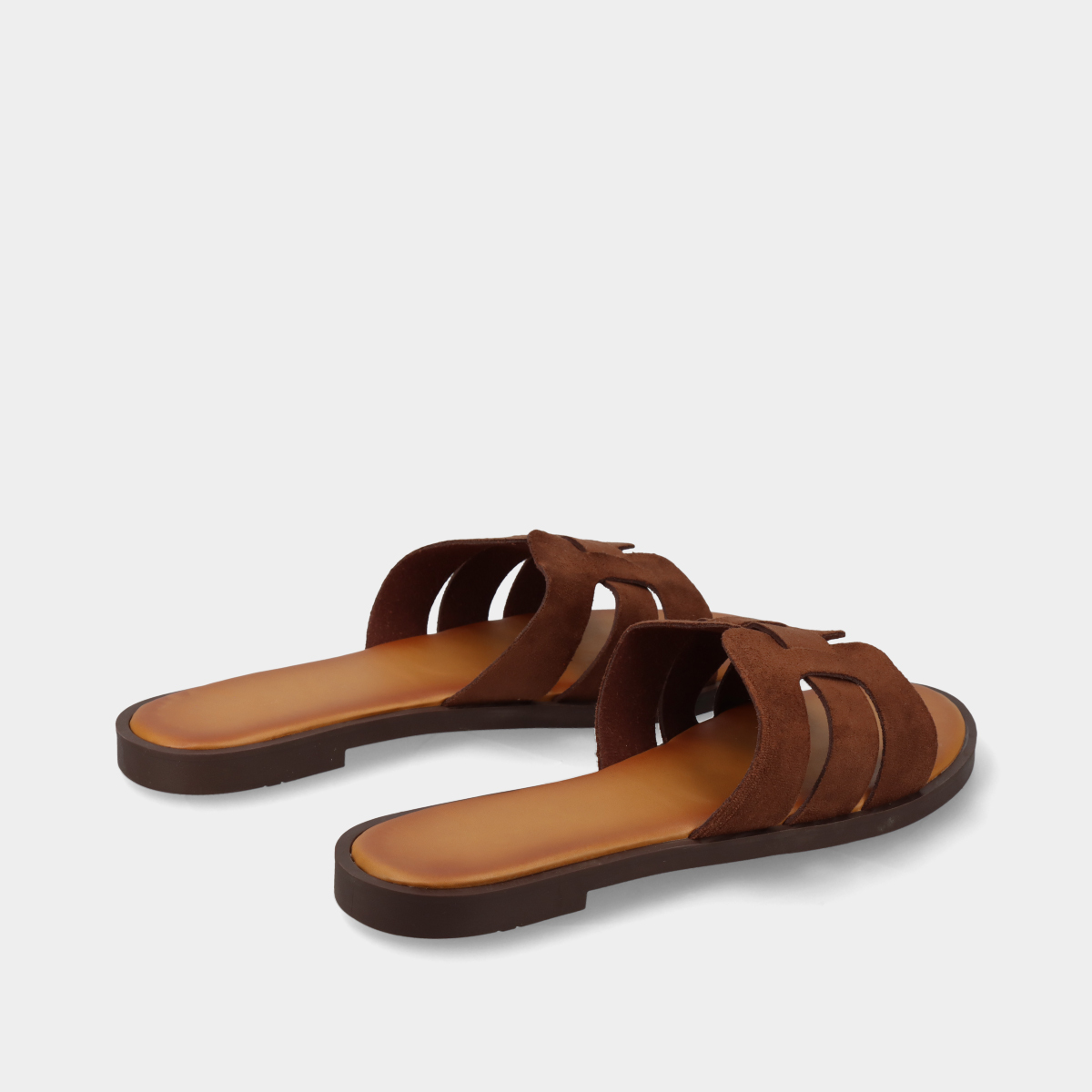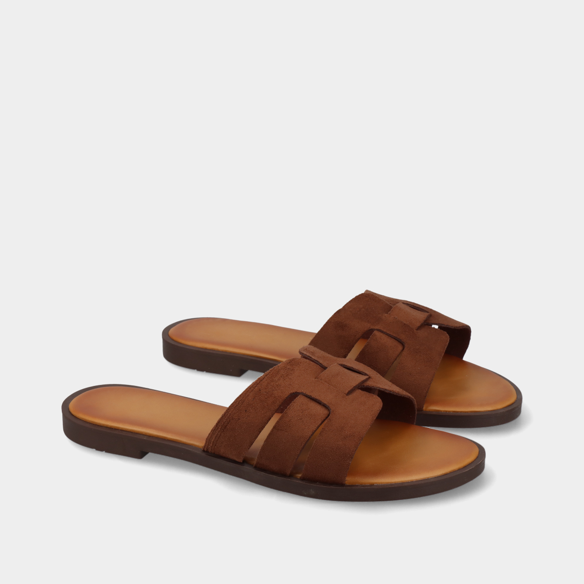 Chinelos rasos castanhos para mulher com efeito camurça e pala recortada. Modelo leve e confortável, ideal para o verão, combinando um estilo moderno, minimalista e elegante.