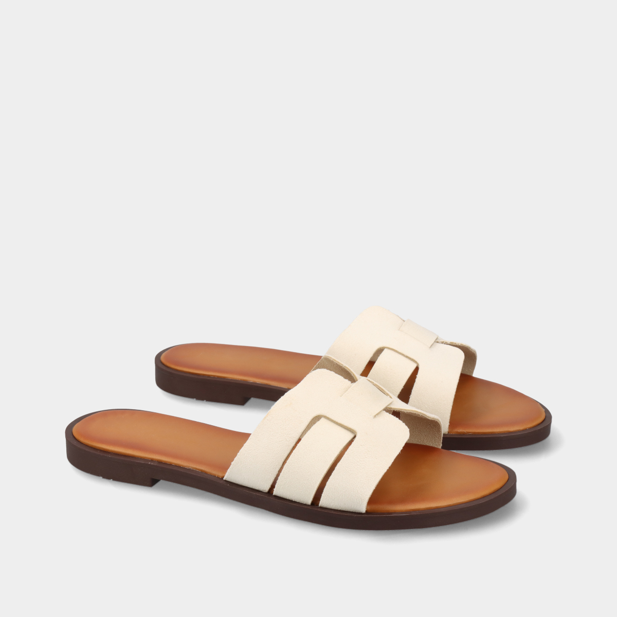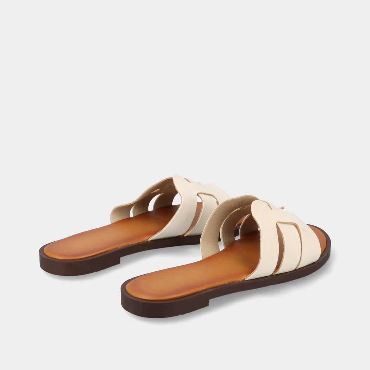 Chinelos rasos bege para mulher com efeito camurça e pala recortada. Modelo leve e confortável, ideal para o verão, combinando um estilo moderno, minimalista e elegante.