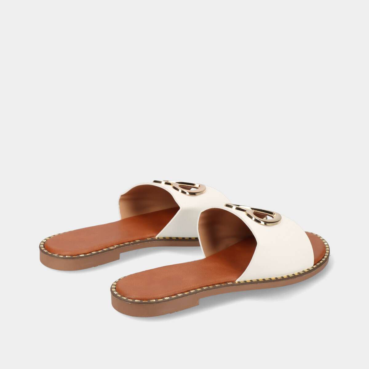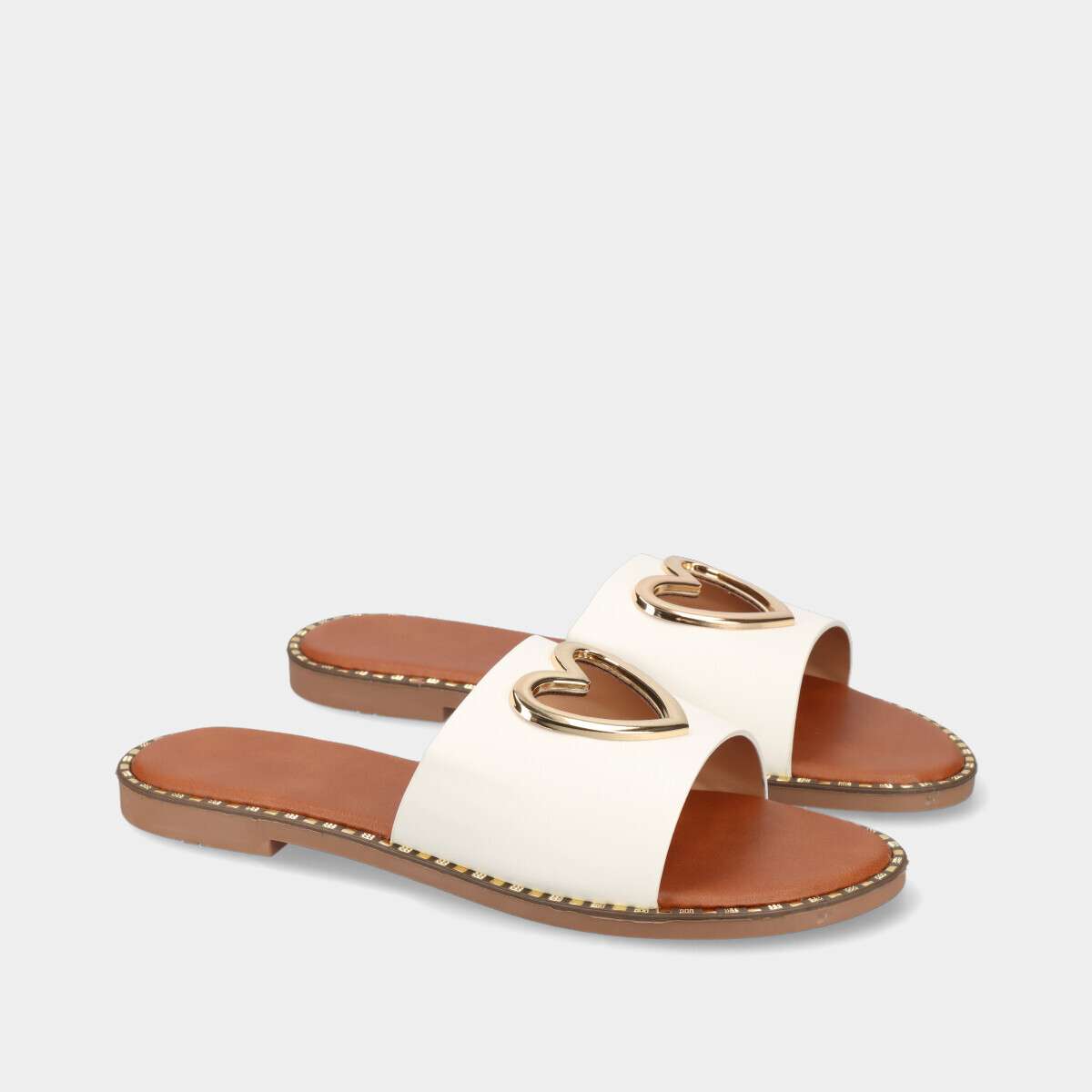 Chinelo raso para mulher em branco, com tira larga sobre o peito do pé e coração metálico dourado perfurado. Ideal para os dias quentes da primavera e do verão, combina estilo e conforto.
