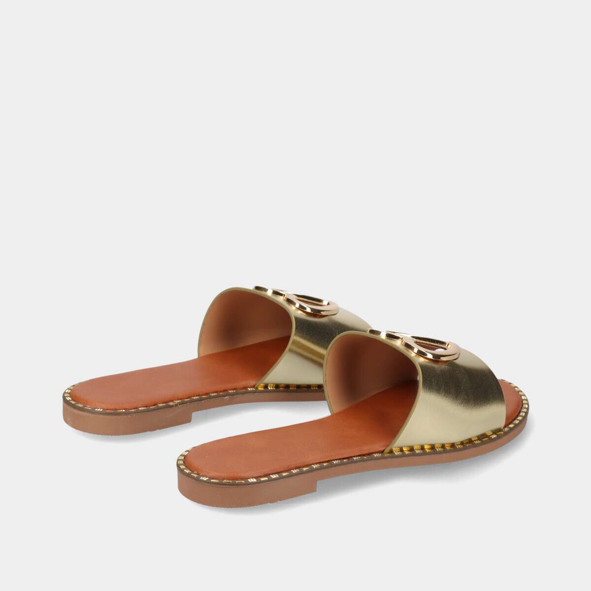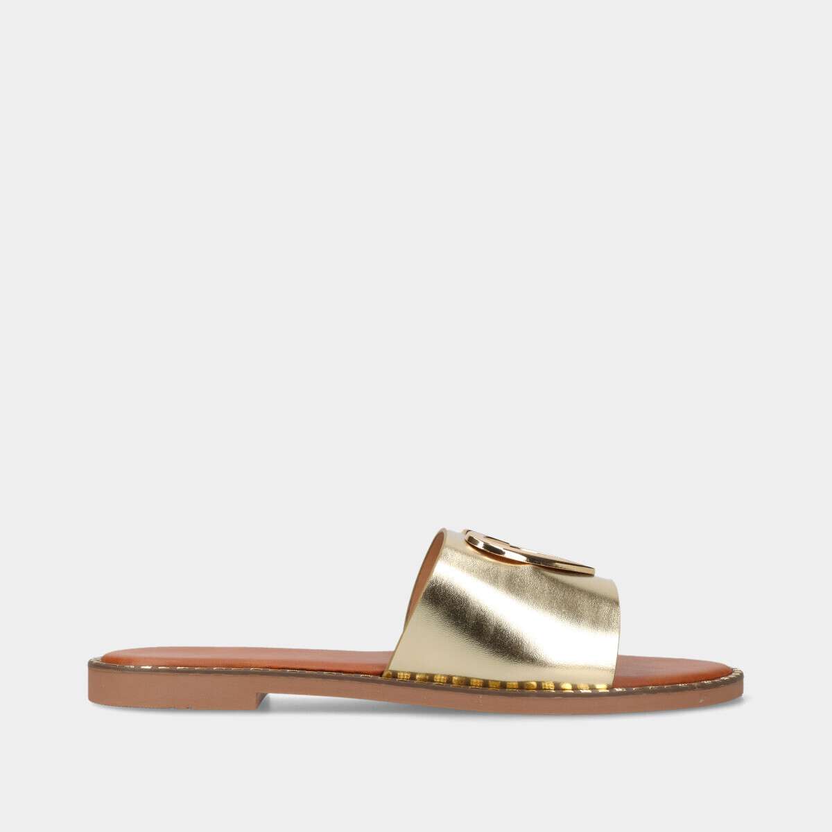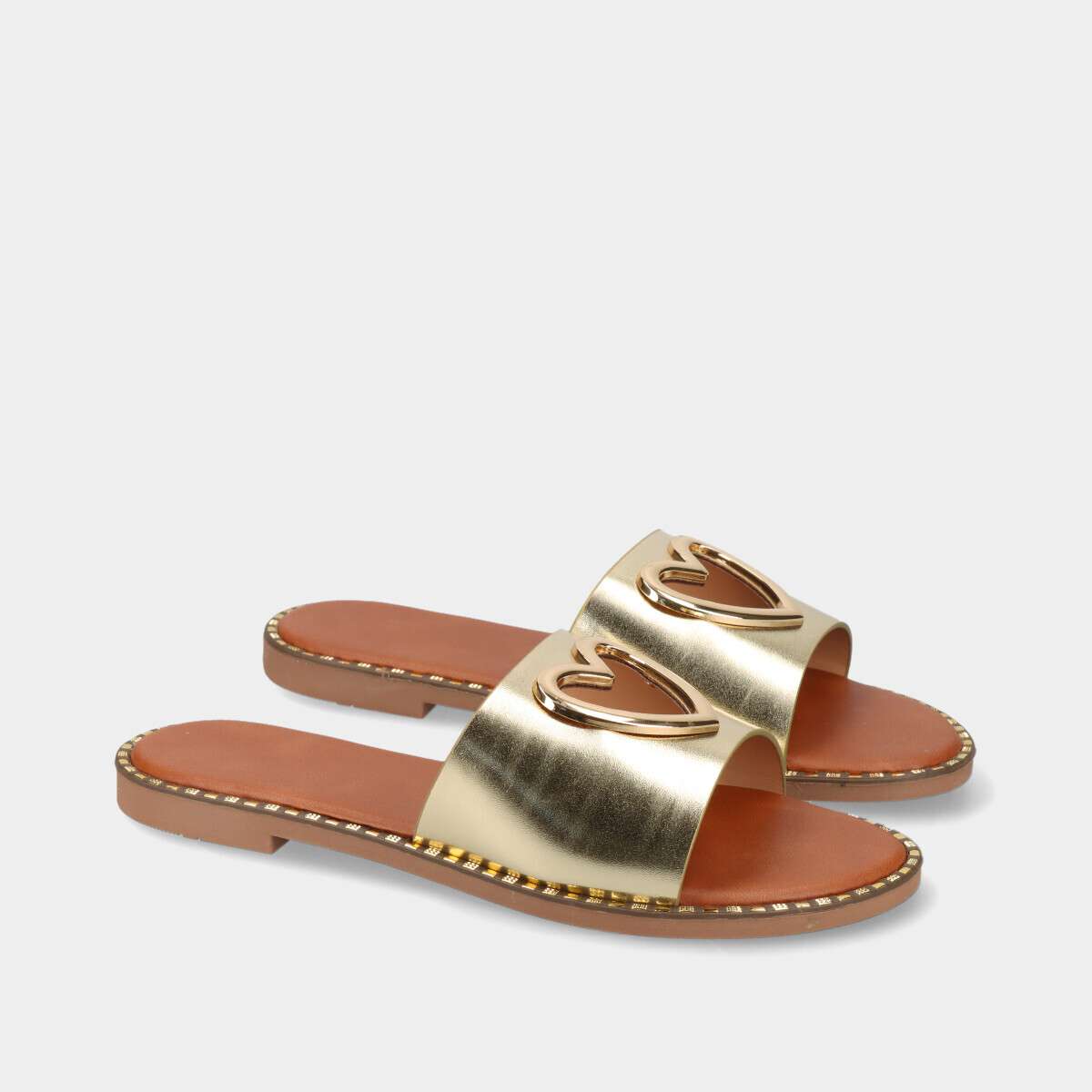 Chinelo raso para mulher em dourado, com tira larga sobre o peito do pé e coração metálico dourado perfurado. Ideal para os dias quentes da primavera e do verão, combina estilo e conforto.