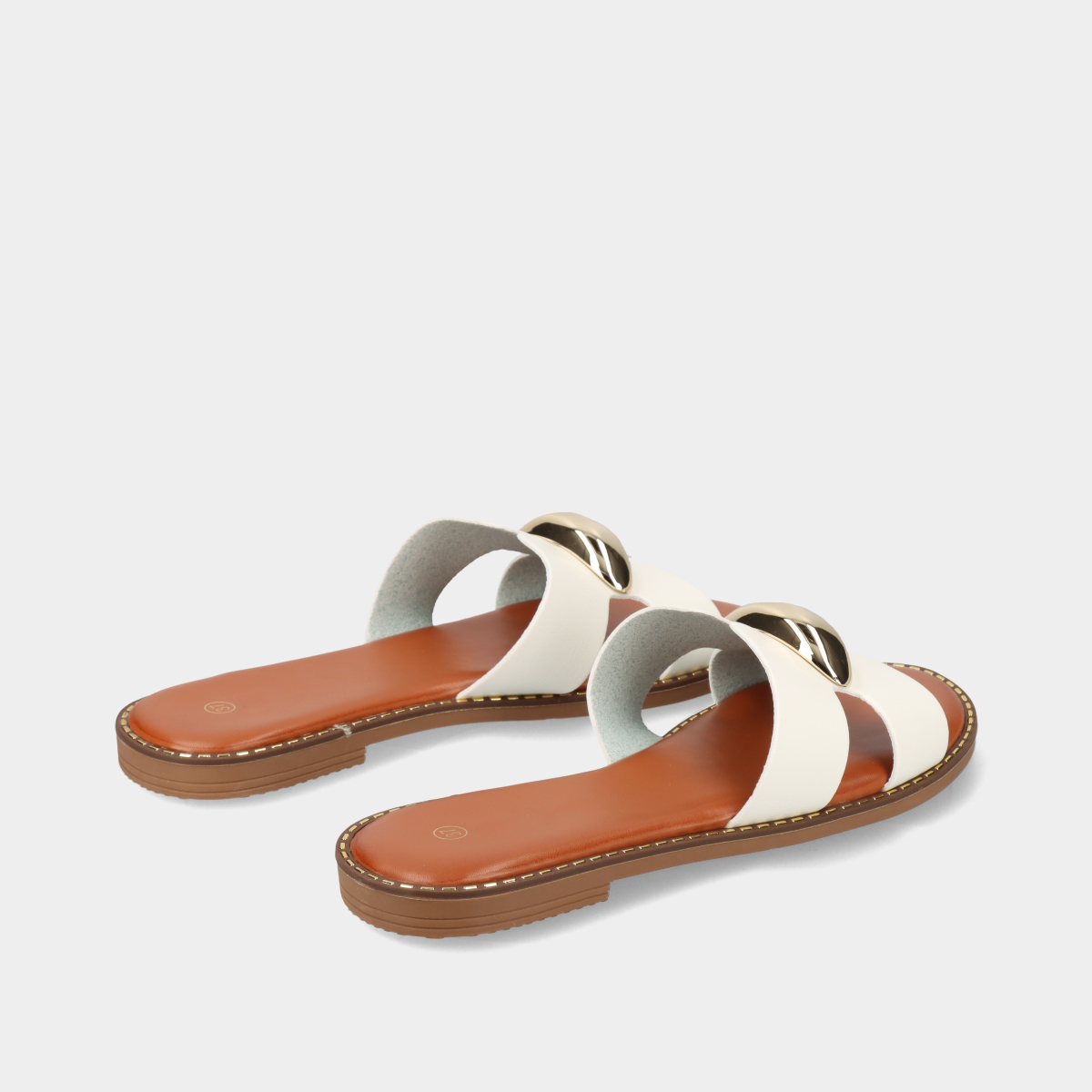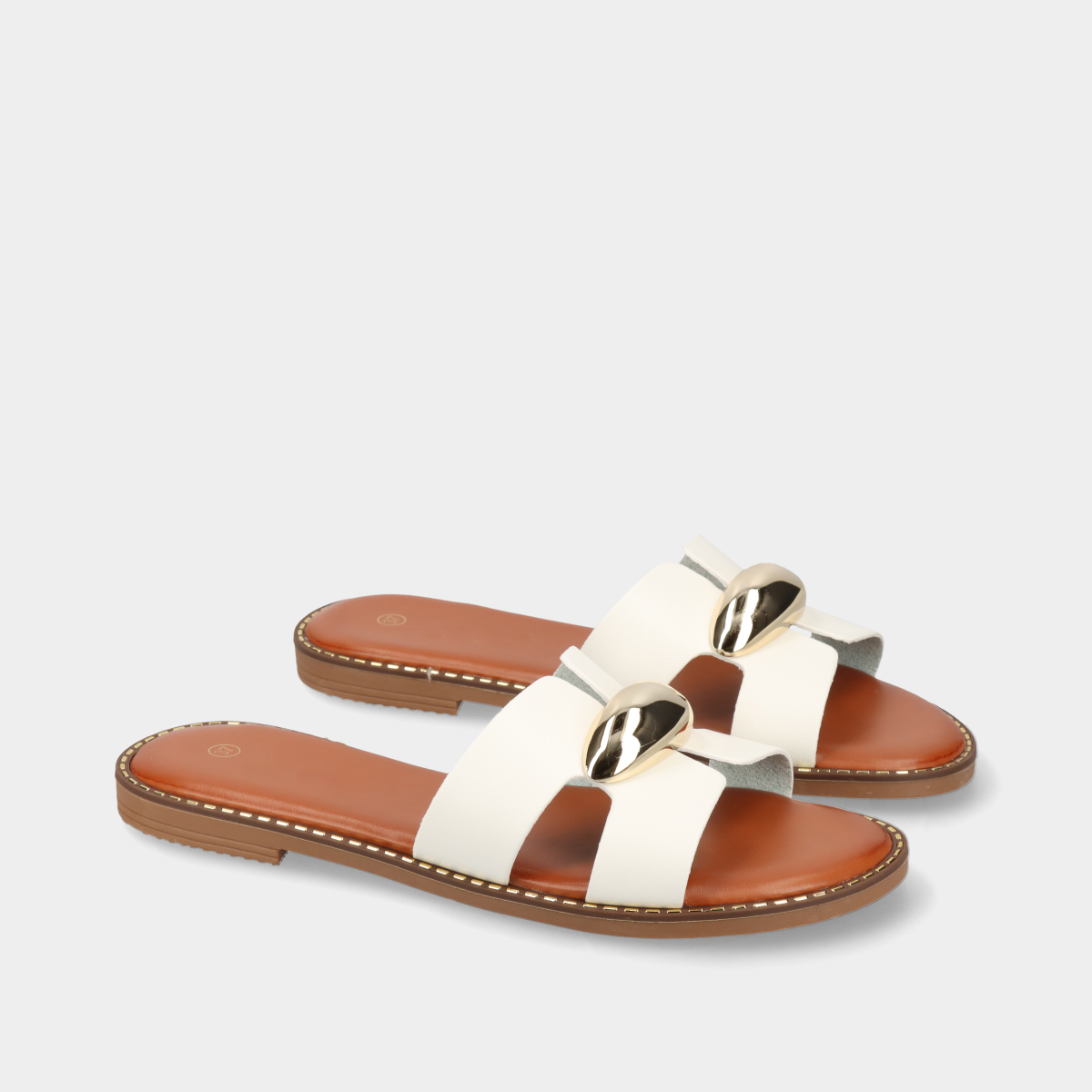 Chinelos rasos brancos para mulher com pala larga recortada e aplicação dourada. Modelo leve e confortável, ideal para o verão, combinando estilo moderno e elegância em qualquer look.