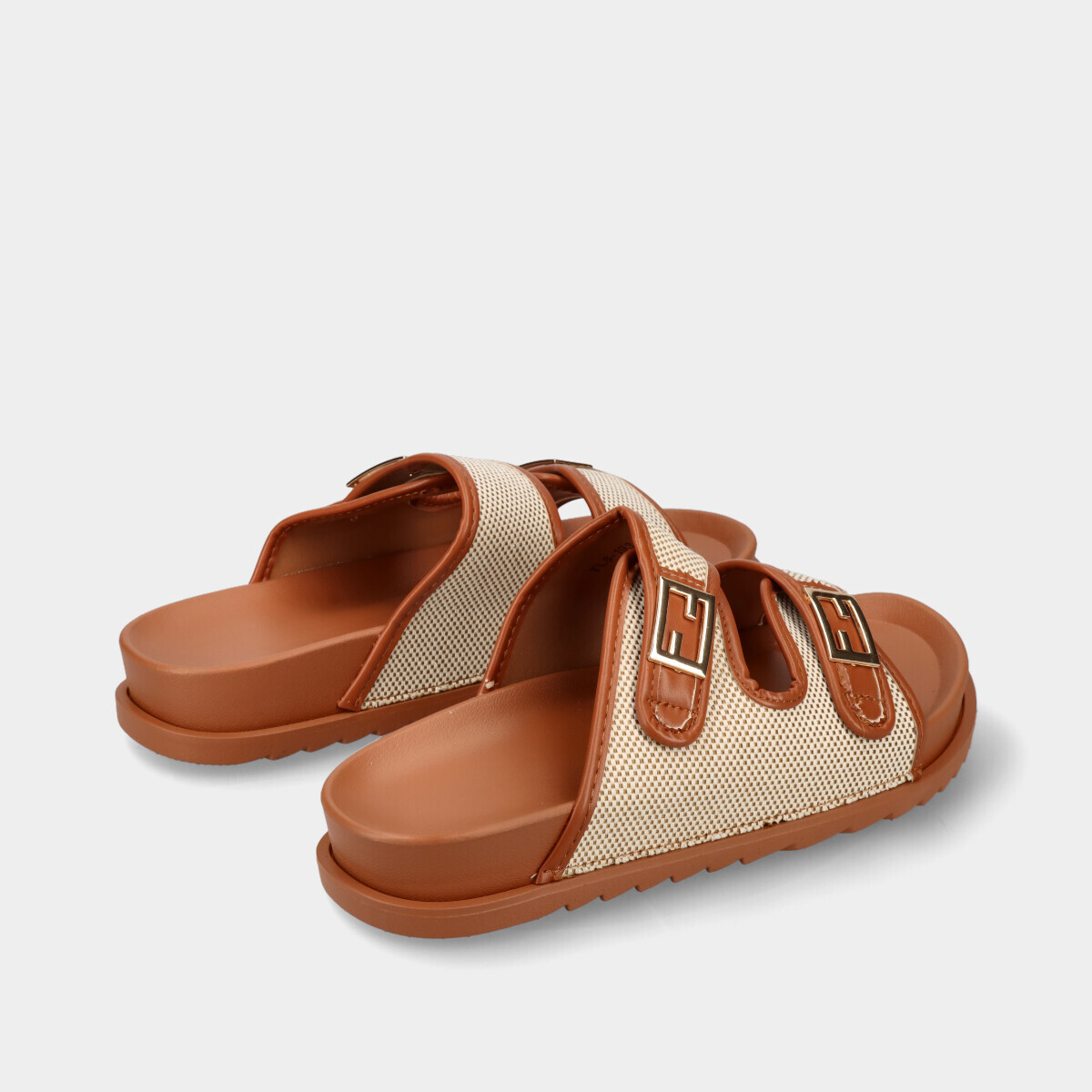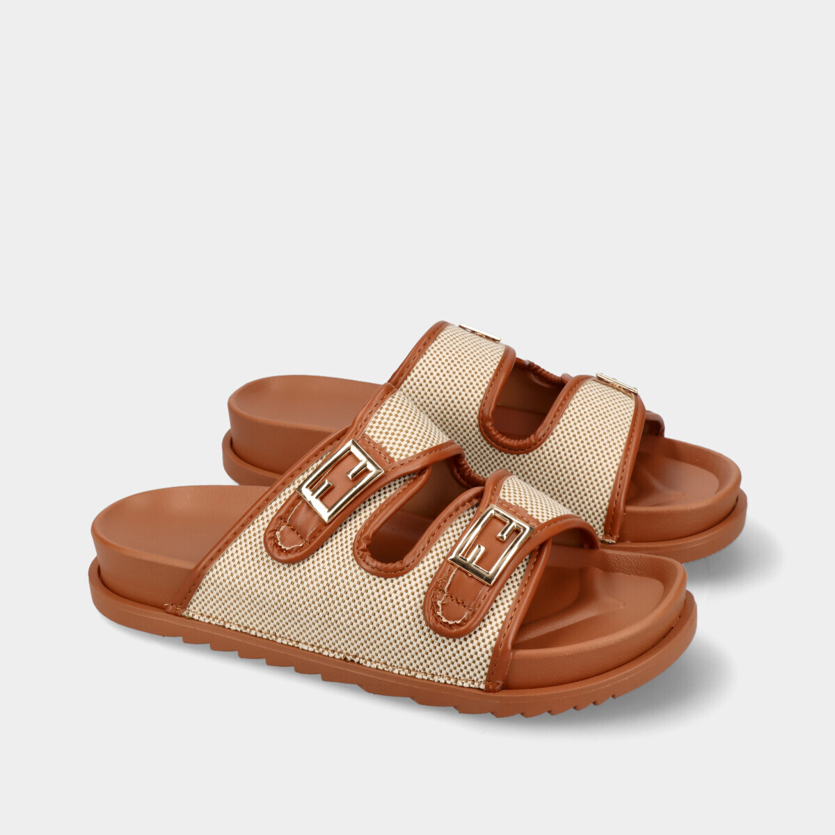 Chinelo anatómico para mulher, em camel, flexível e confortável, com duas aplicações douradas decorativas.
