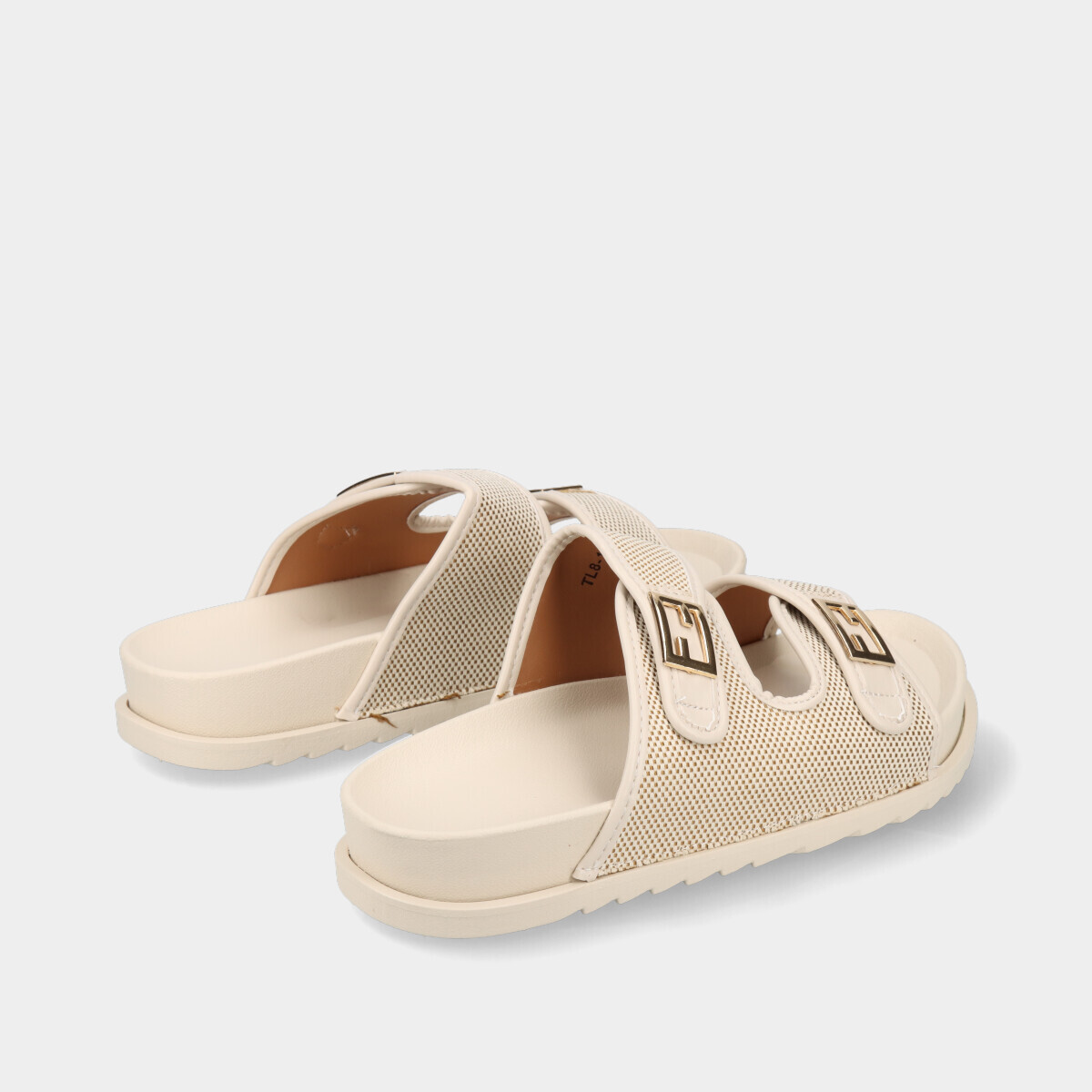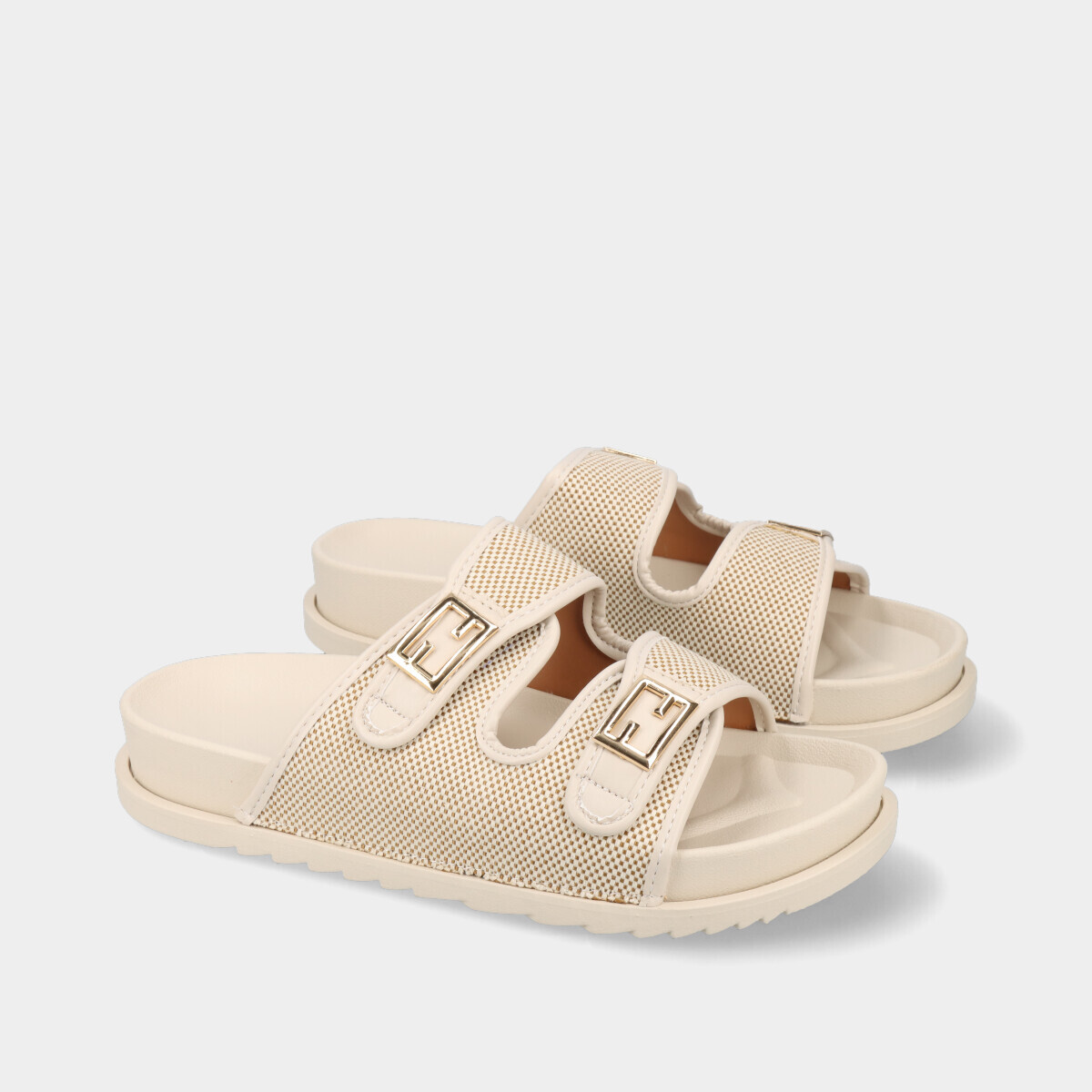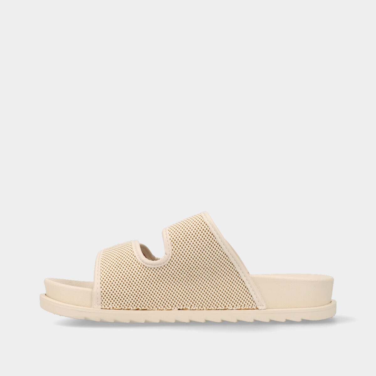 Chinelo anatómico para mulher, em bege, flexível e confortável, com duas aplicações douradas decorativas.