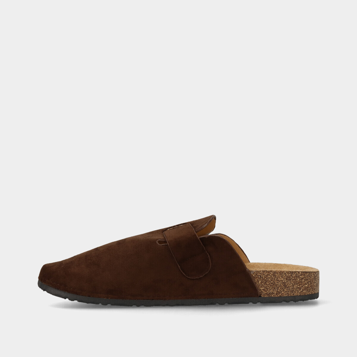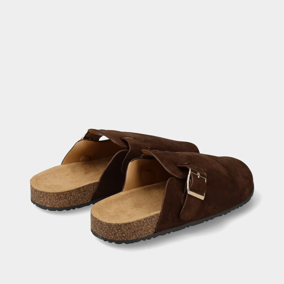 Soca anatómica em castanho para mulher, com fivela dourada ajustável. Conforto e estilo para o dia a dia, combinando praticidade e elegância.