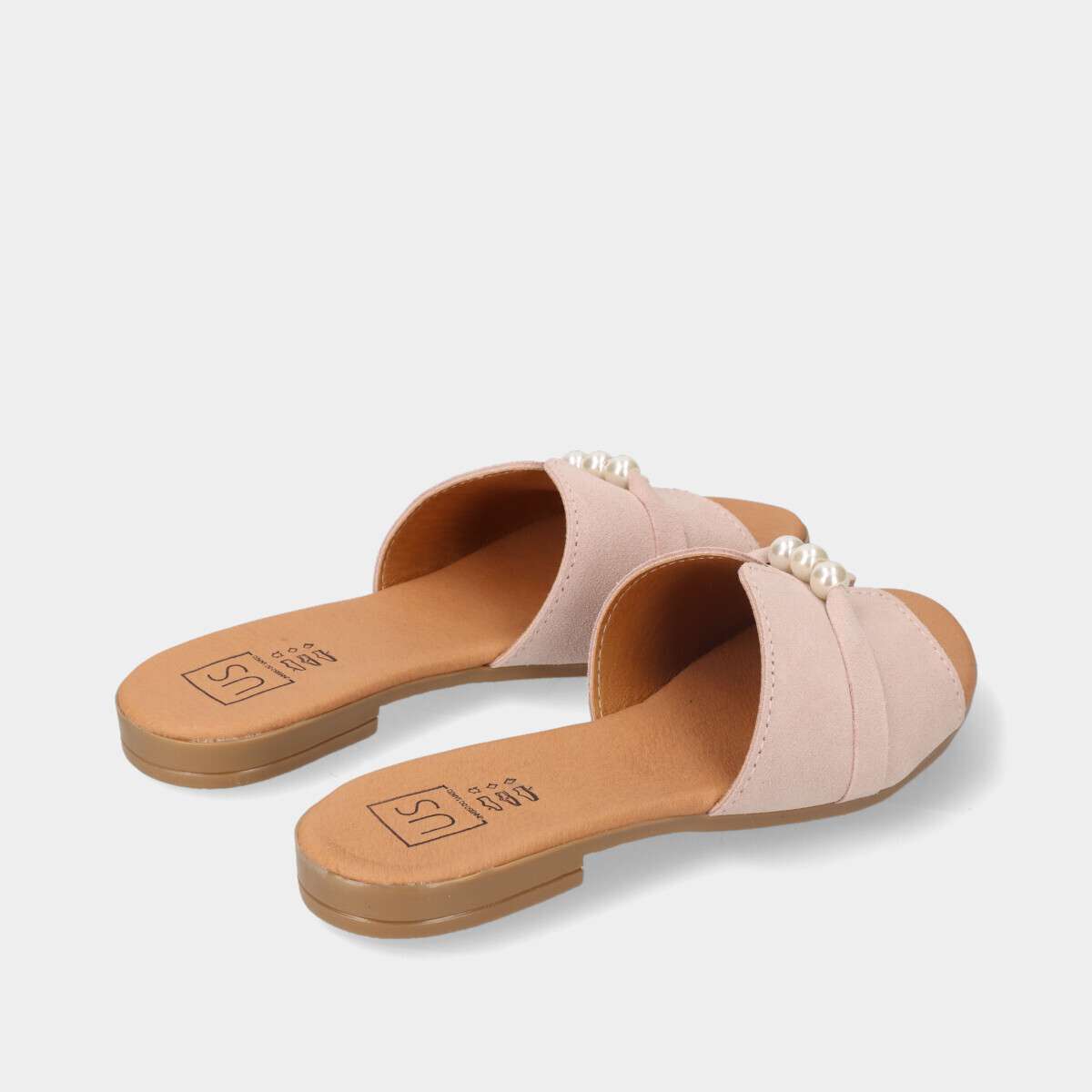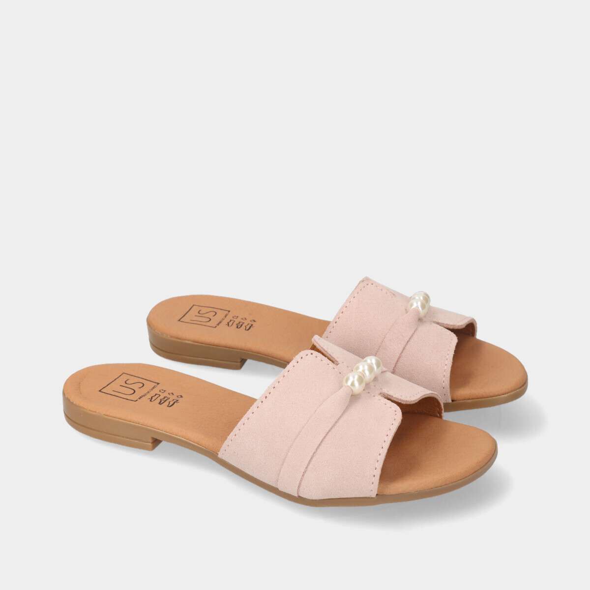 Chinelo confortável de mulher em pele camurça na cor nude com aplicação de pérolas brancas no peito do pé!