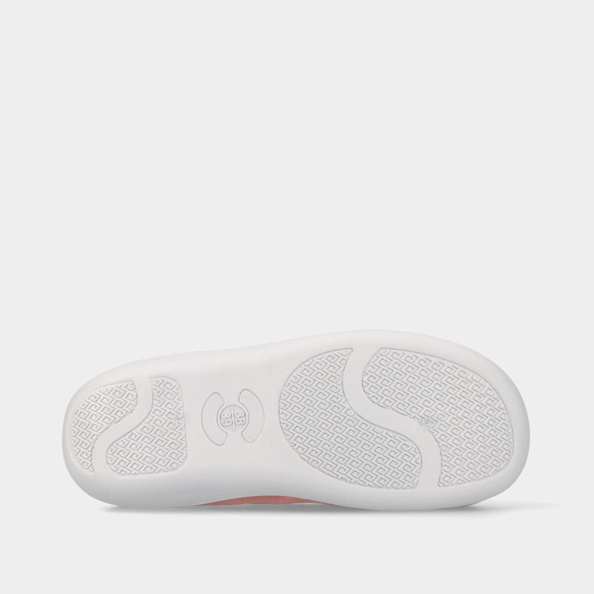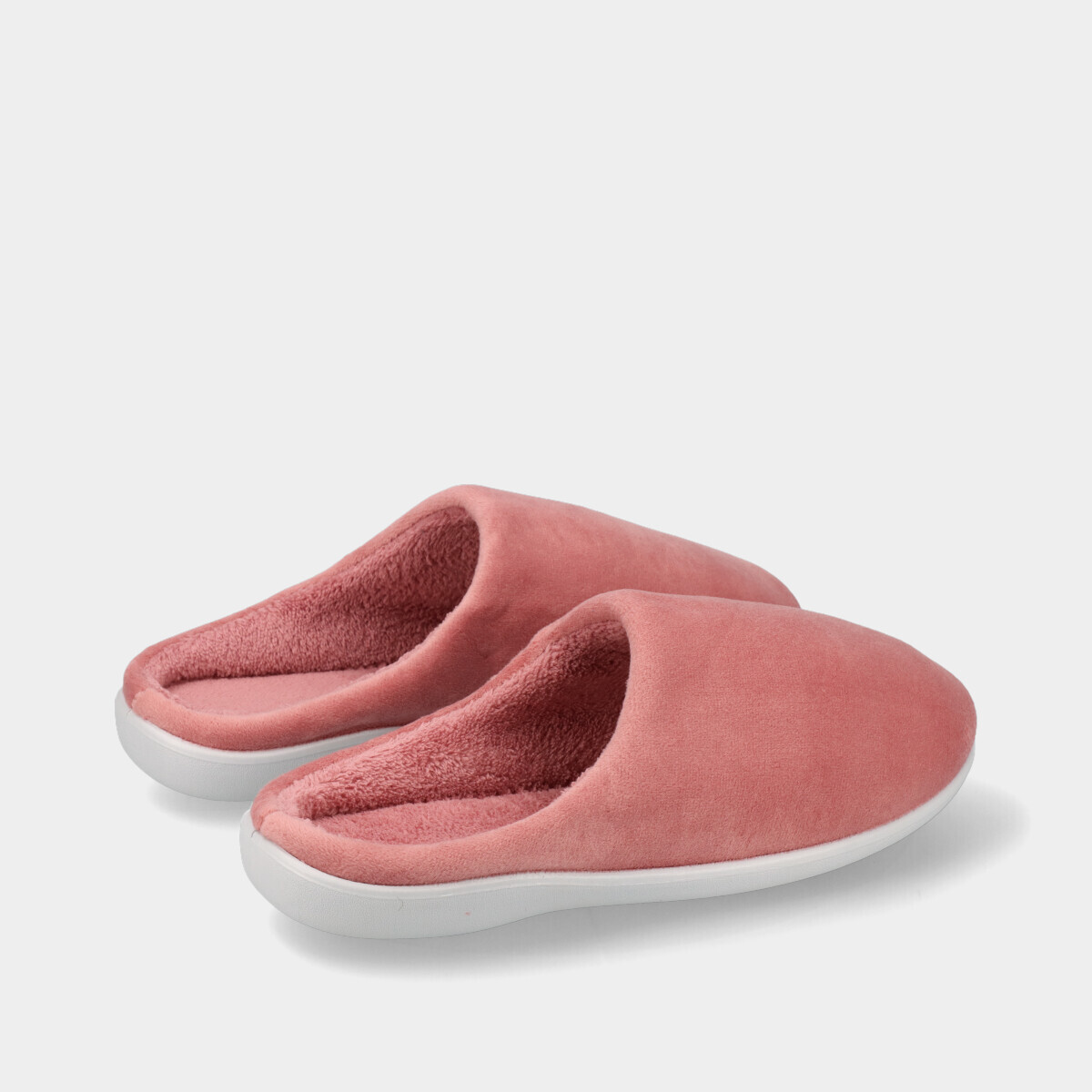 Chinelo de quarto rosa para mulher, com forro de pelo macio e sola de borracha.