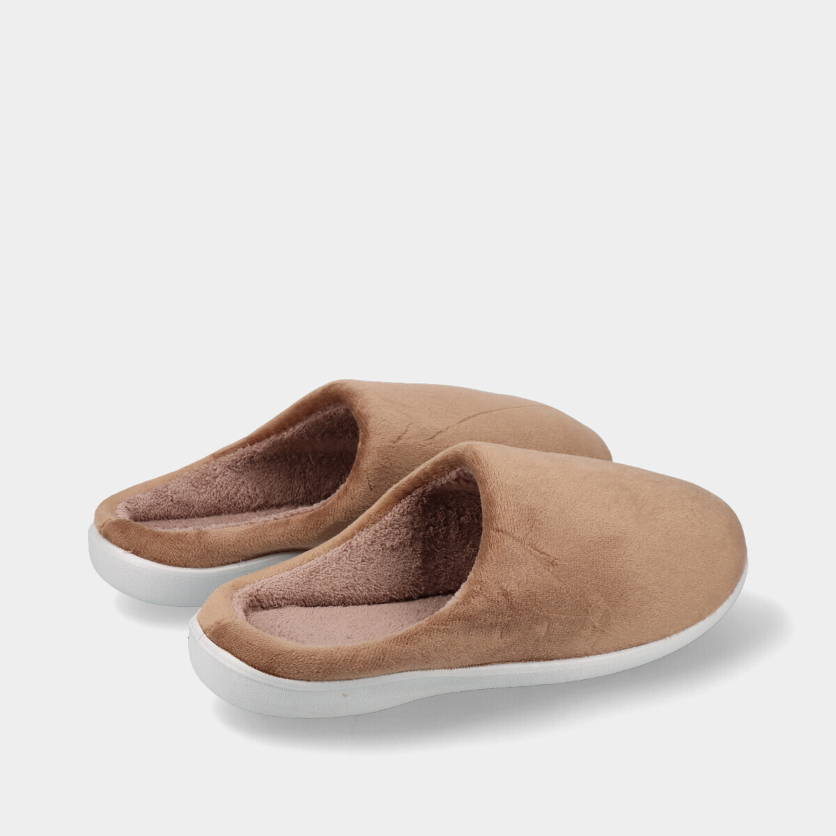 Chinelo de quarto castanho para mulher, com forro de pelo macio e sola de borracha.