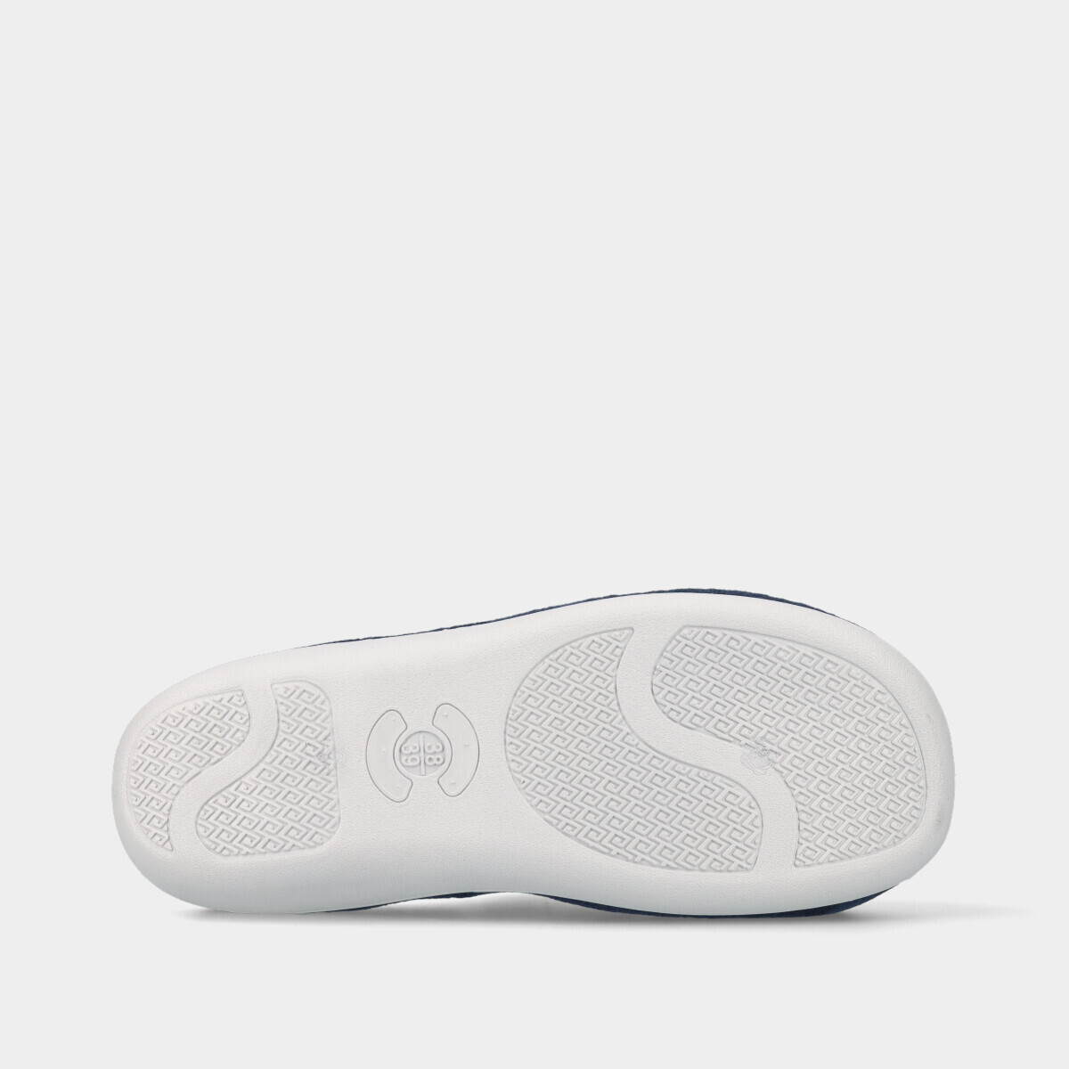 Chinelo de quarto azul para mulher, com forro de pelo macio e sola de borracha.