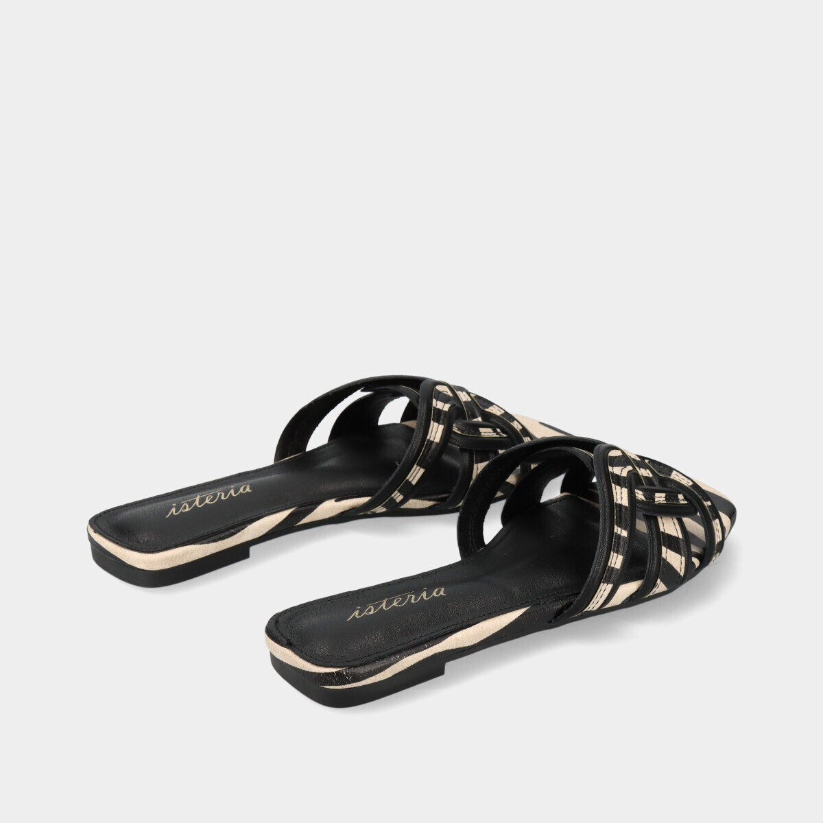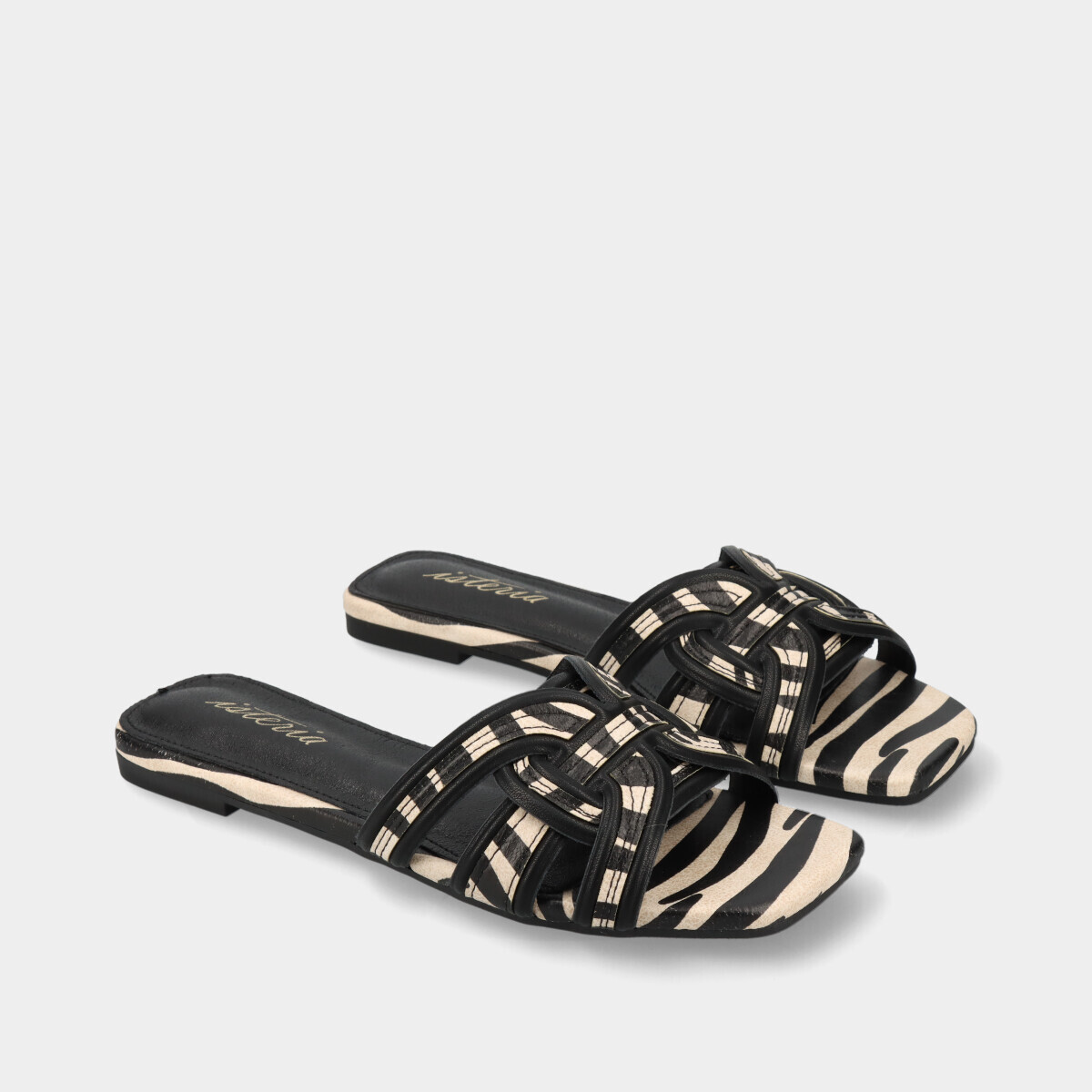 Chinelos rasos com efeito pele de zebra para mulher, com pala recortada. Modelo leve e confortável, ideal para o verão, que combina um estilo moderno, minimalista e elegante. 100% vegan, uma escolha consciente para quem valoriza a moda sustentável, sem comprometer a elegância nem os valores ambientais.