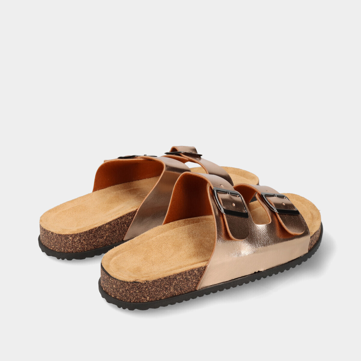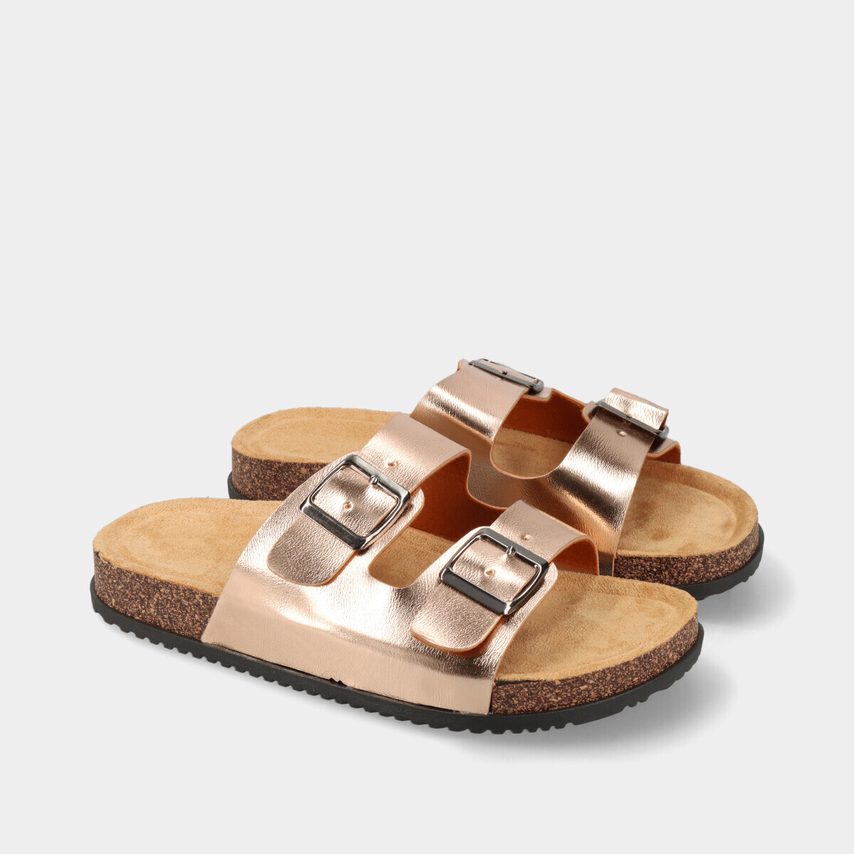 Chinelos anatómicos rosa dourado para mulher com duas tiras e fivelas ajustáveis na lateral e palmilha confortável. Modelo leve e prático, ideal para o dia a dia no verão, combinando conforto e estilo casual.