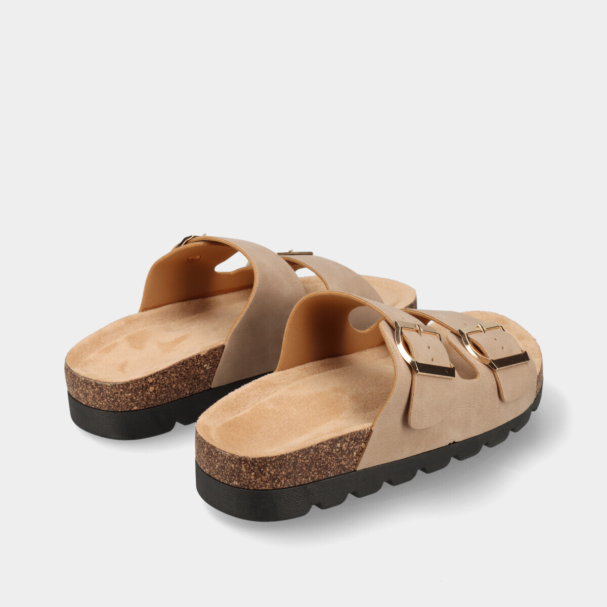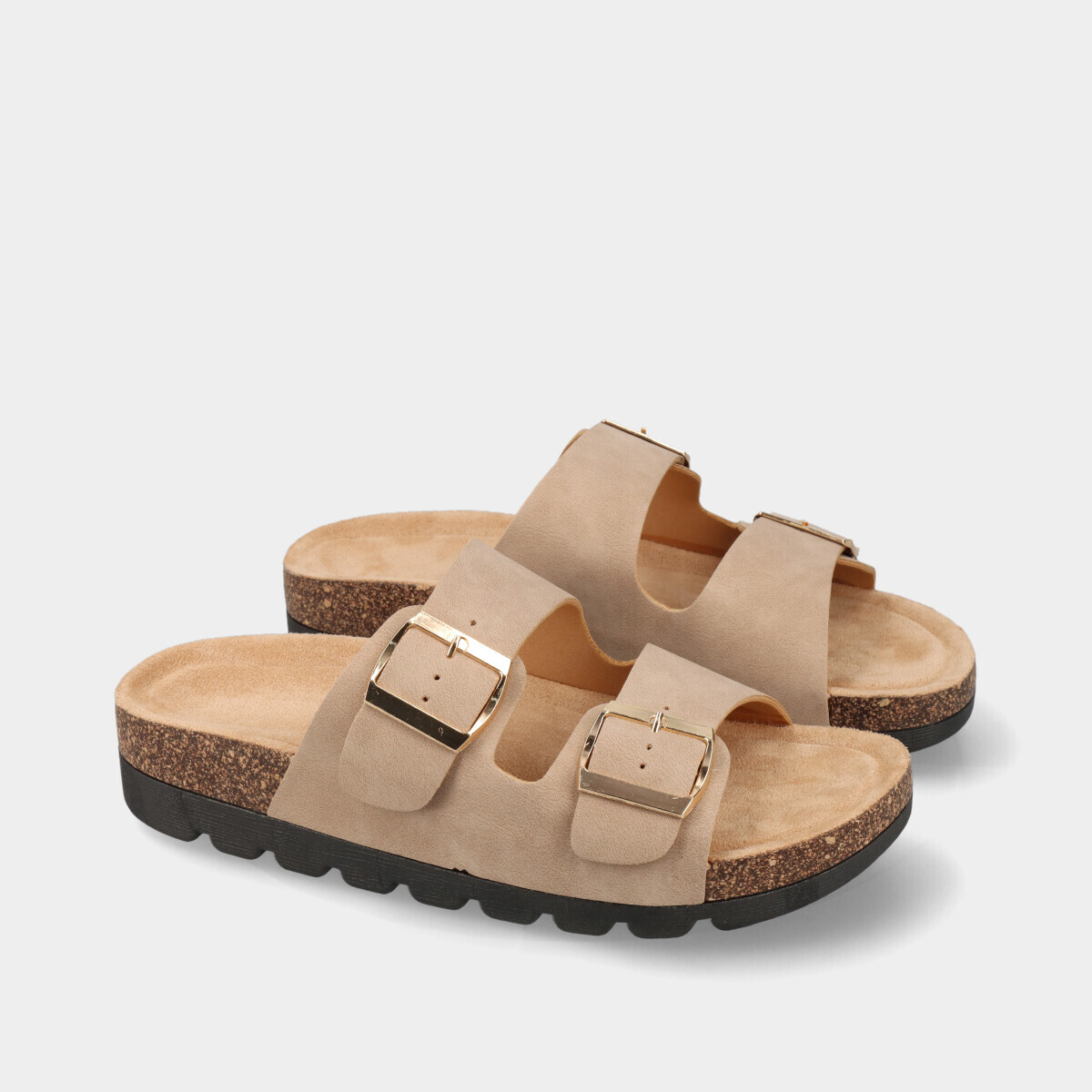 Chinelos anatómicos bege para mulher com duas tiras e fivelas ajustáveis na lateral e palmilha confortável. Modelo leve e prático, ideal para o dia a dia no verão, combinando conforto e estilo casual.