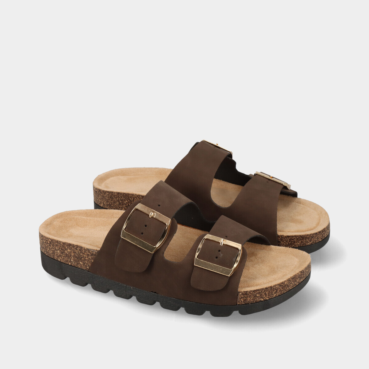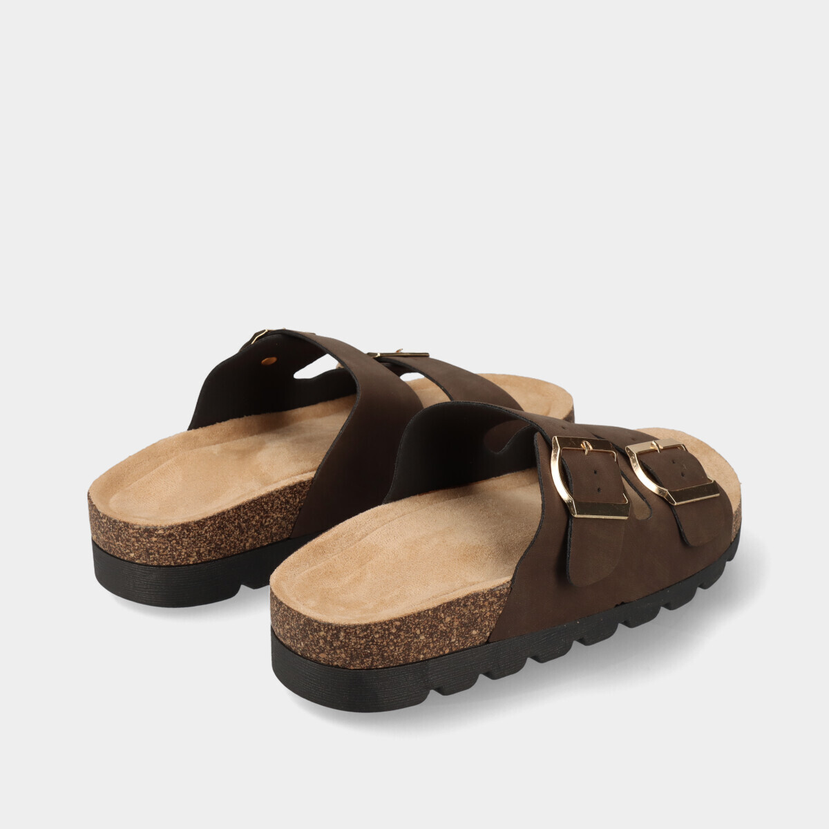 Chinelos anatómicos castanhos para mulher com duas tiras e fivelas ajustáveis na lateral e palmilha confortável. Modelo leve e prático, ideal para o dia a dia no verão, combinando conforto e estilo casual.