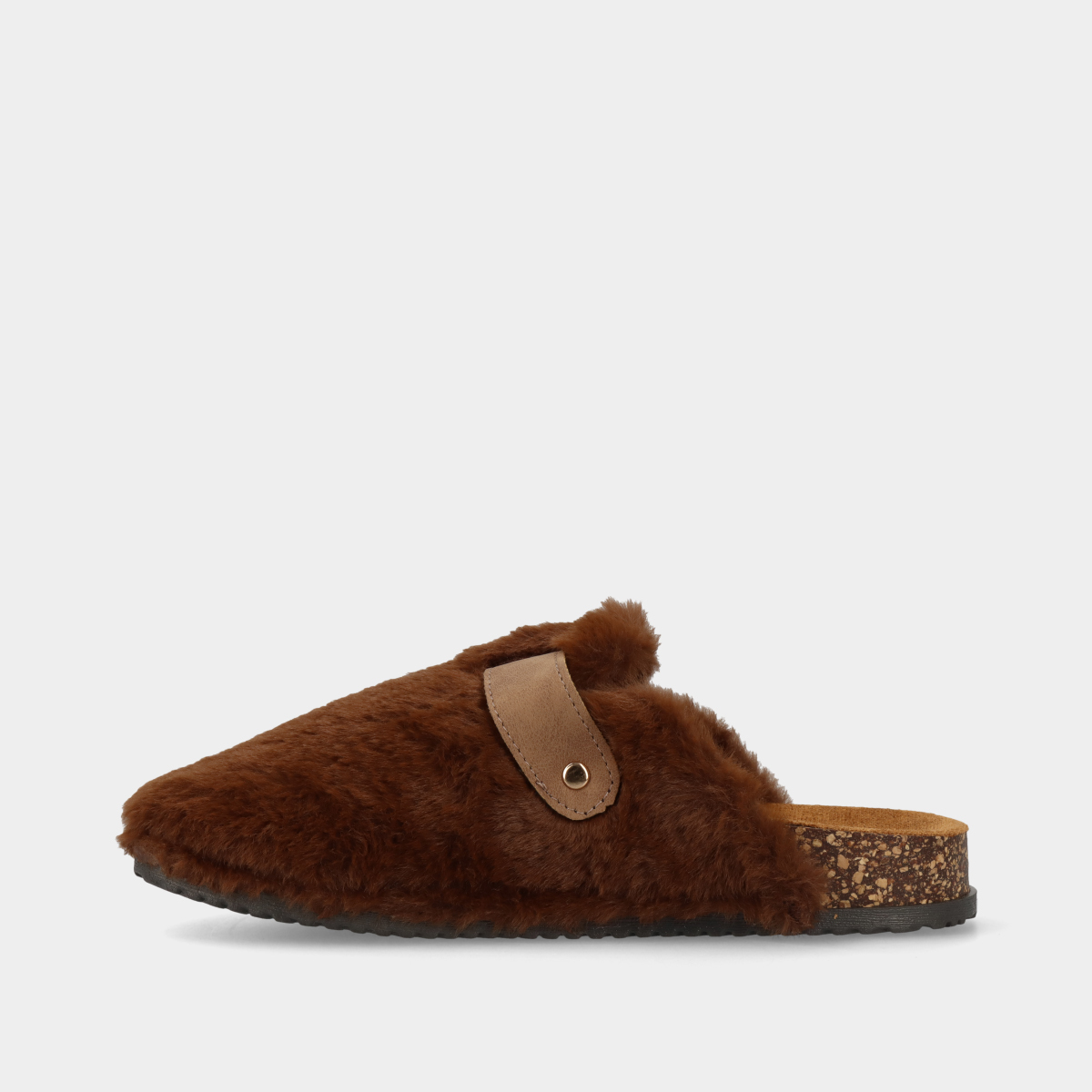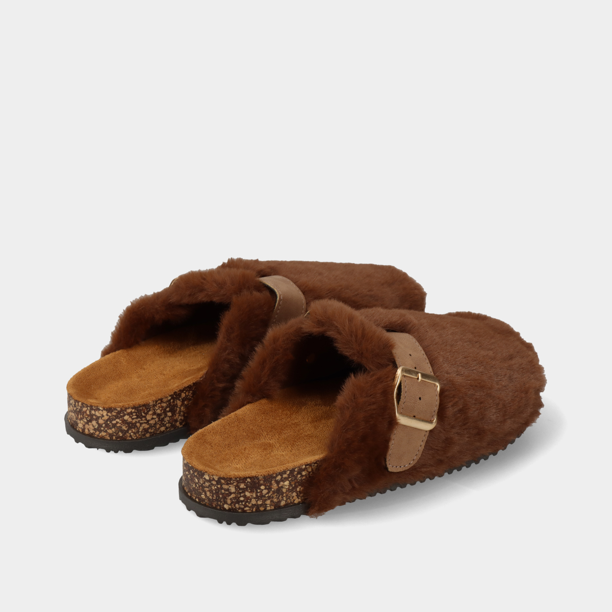 Soca anatómica em castanho para mulher, com pelo e fivela dourada ajustável. Conforto e estilo para o dia a dia, combinando praticidade e estilo.