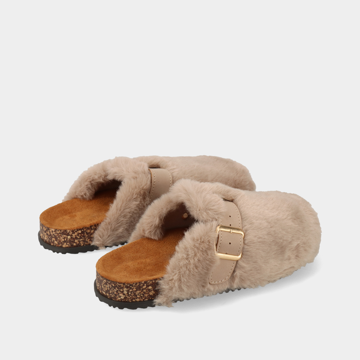 Soca anatómica em taupe para mulher, com pelo e fivela dourada ajustável. Conforto e estilo para o dia a dia, combinando praticidade e estilo.