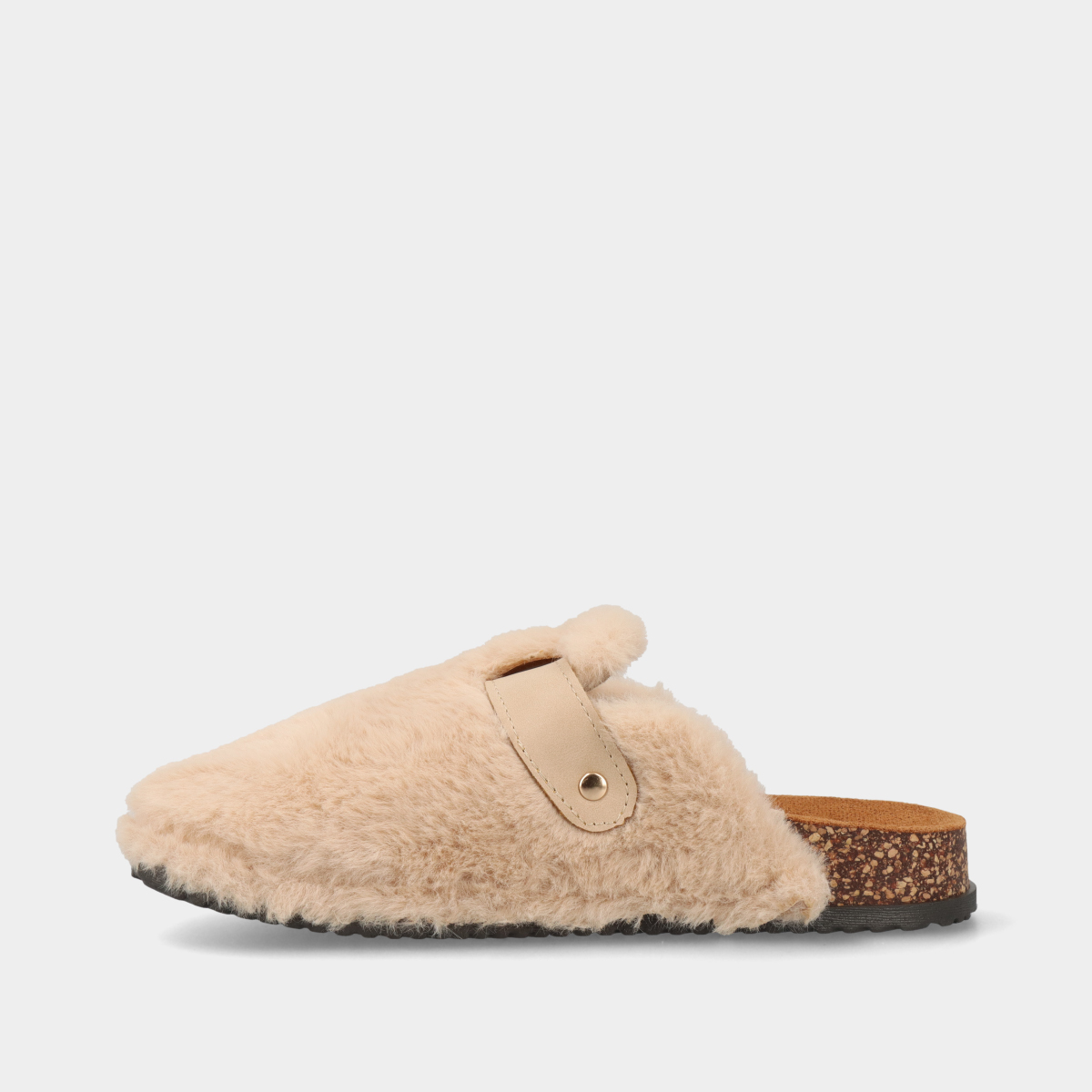 Soca anatómica em bege para mulher, com pelo e fivela dourada ajustável. Conforto e estilo para o dia a dia, combinando praticidade e estilo.