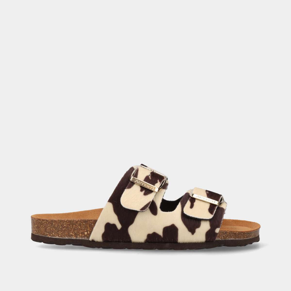 Chinelo anatómico em pele para mulher, com padrão animal print vaca, palmilha em cortiça 100% natural e duas fivelas douradas ajustáveis. Ideal para o dia a dia, combina estilo, conforto e durabilidade.