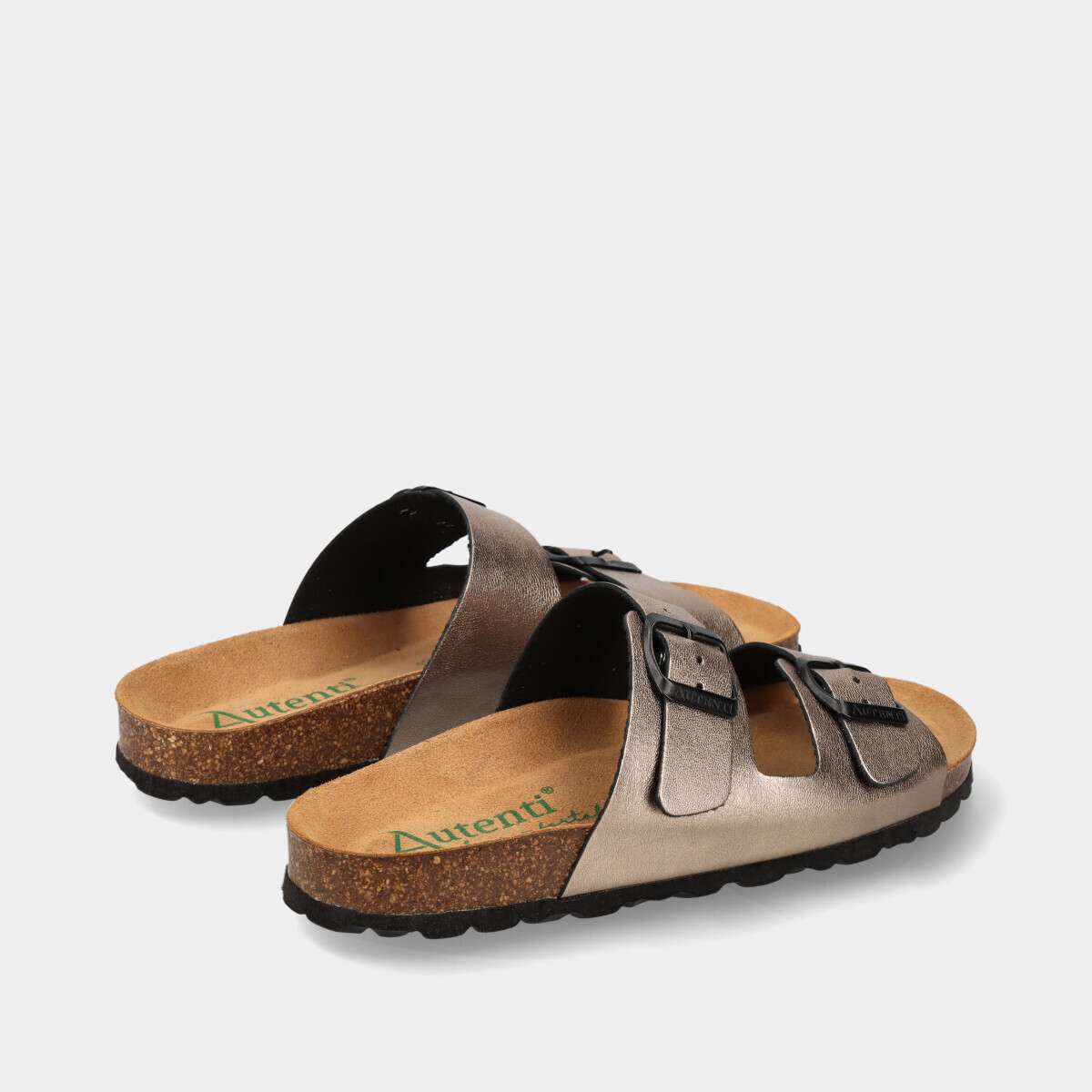 Chinelo anatómico em pele para mulher, na cor bronze, com palmilha em cortiça 100% natural e duas fivelas douradas ajustáveis. Ideal para o dia a dia, combina estilo, conforto e durabilidade.