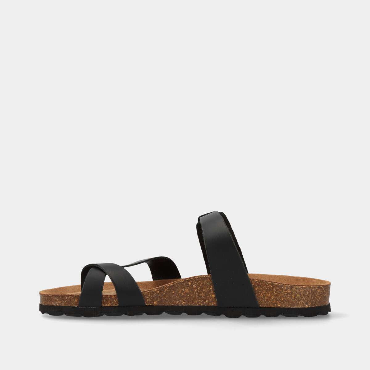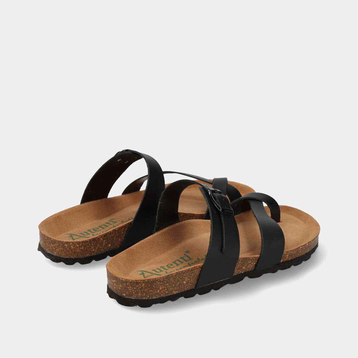 Chinelo de dedo anatómico em pele para mulher, na cor preta, com palmilha em cortiça 100% natural e fivela dourada ajustável. Ideal para o dia a dia, combina estilo, conforto e durabilidade.