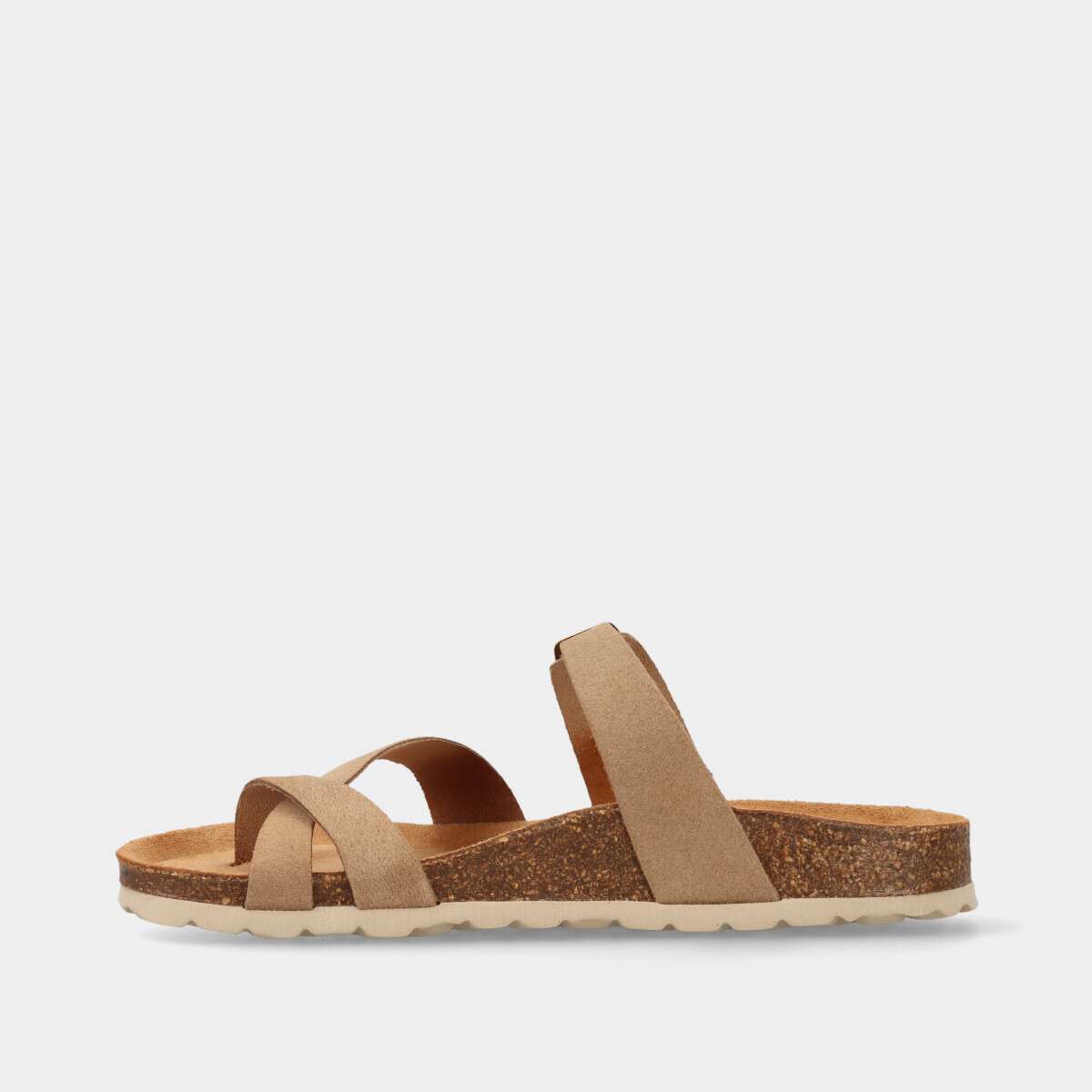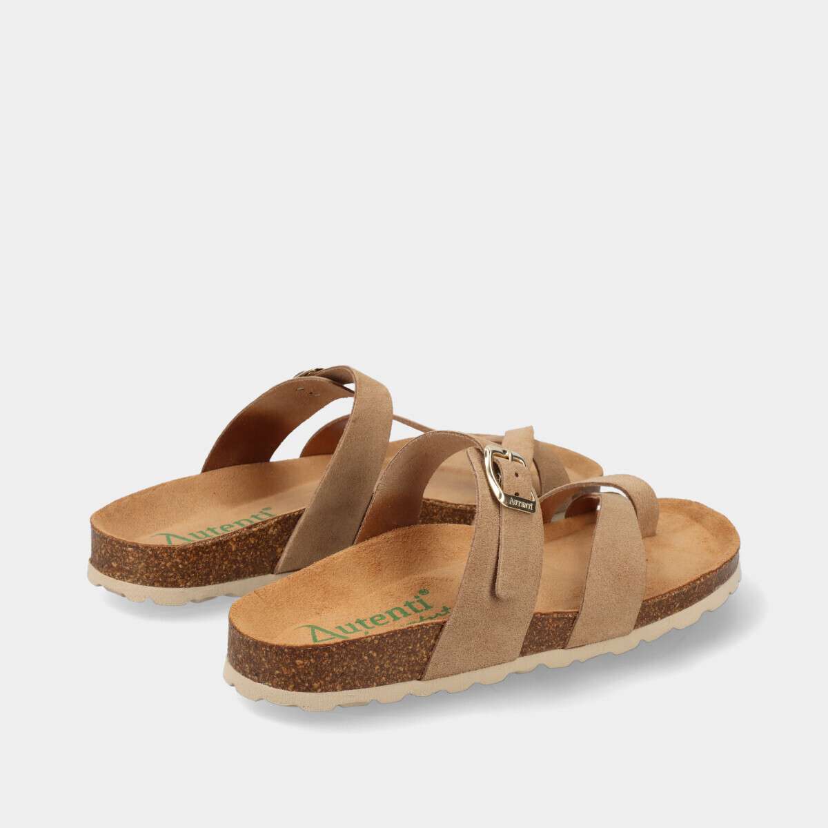 Chinelo de dedo anatómico em pele para mulher, na cor taupe, com palmilha em cortiça 100% natural e fivela dourada ajustável. Ideal para o dia a dia, combina estilo, conforto e durabilidade.