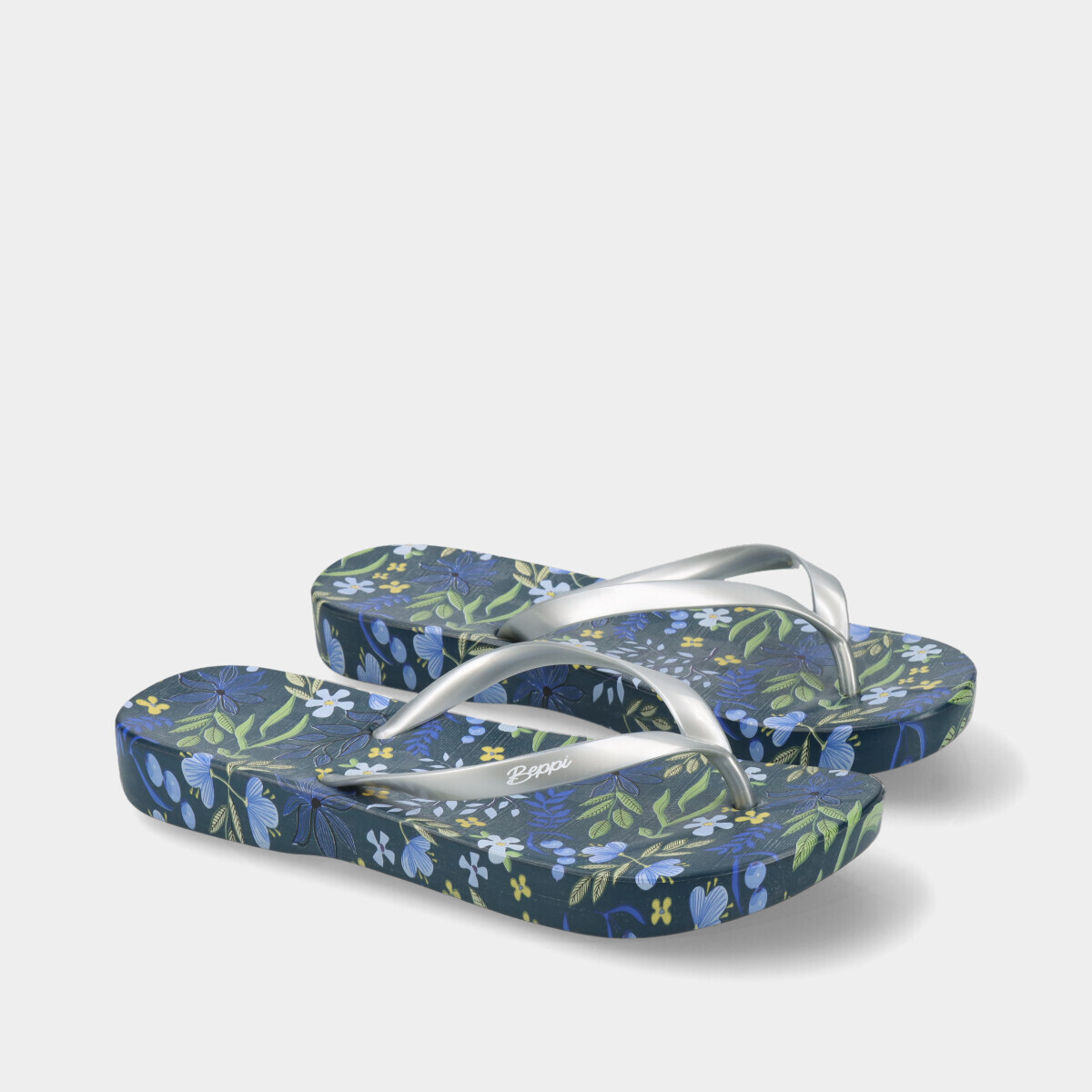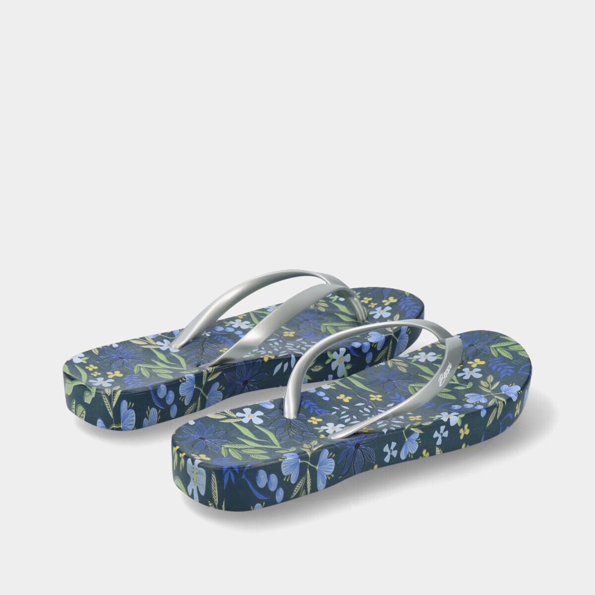 Chinelo de dedo para mulher, azul com estampado floral e tiras prateadas. Leve, confortável e antiderrapante. Ideal para praia, piscina ou uso diário.