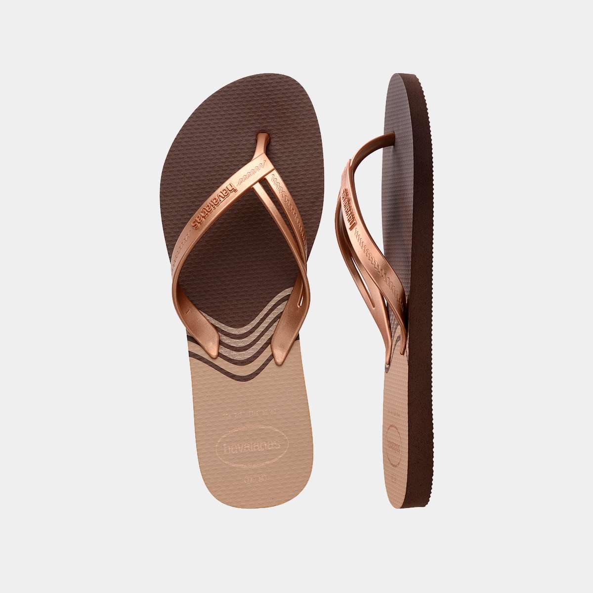 Chinelos Havaianas para mulher em tons castanhos com tiras metalizadas, ideais para quem procura conforto, estilo e leveza nos dias quentes. O design moderno com padrão ondulado e sola durável garante um visual atual e cheio de personalidade.