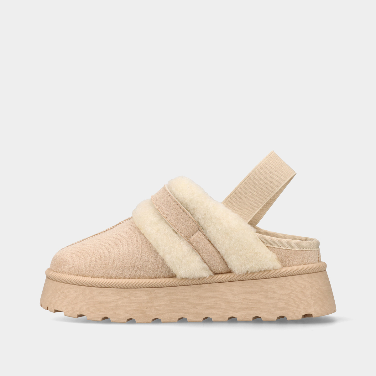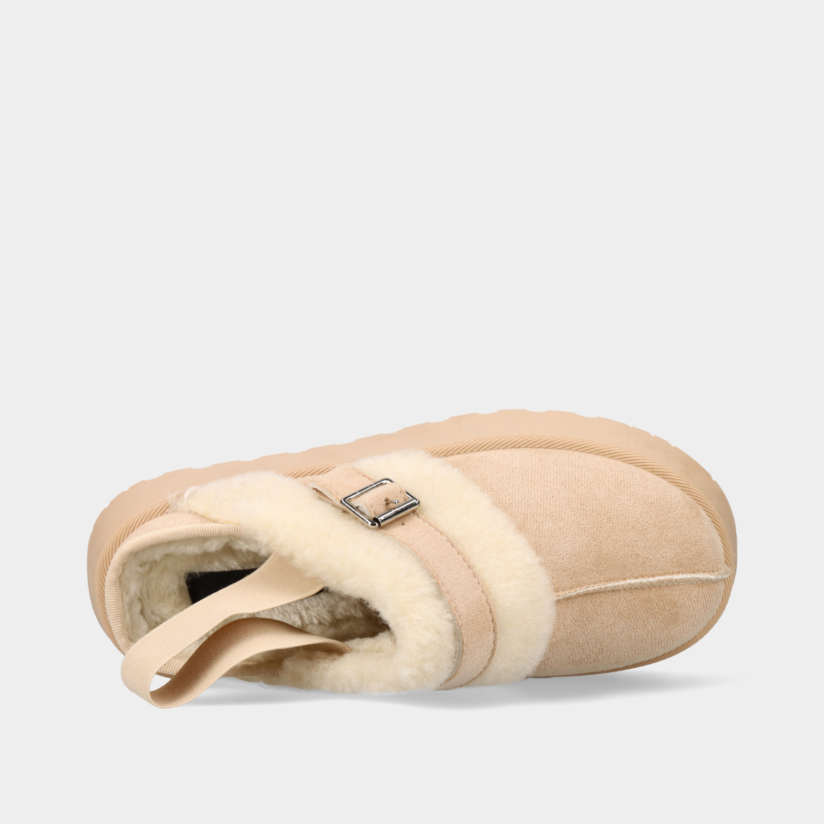 Socas de plataforma para mulher em bege, com forro e gola em pelo quente, ideais para conforto e estilo no outono e inverno.