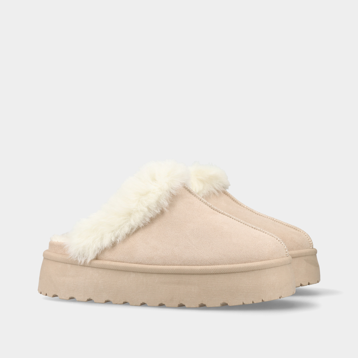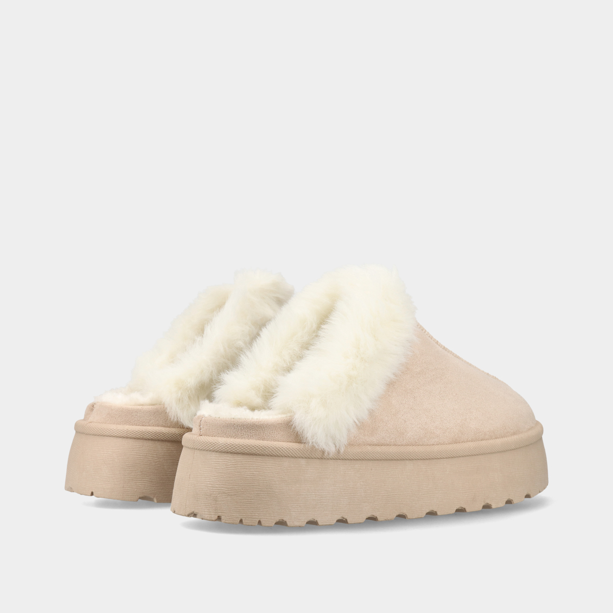Socas de plataforma para mulher em bege, com forro e gola em pelo quente, ideais para conforto e estilo no outono e inverno.