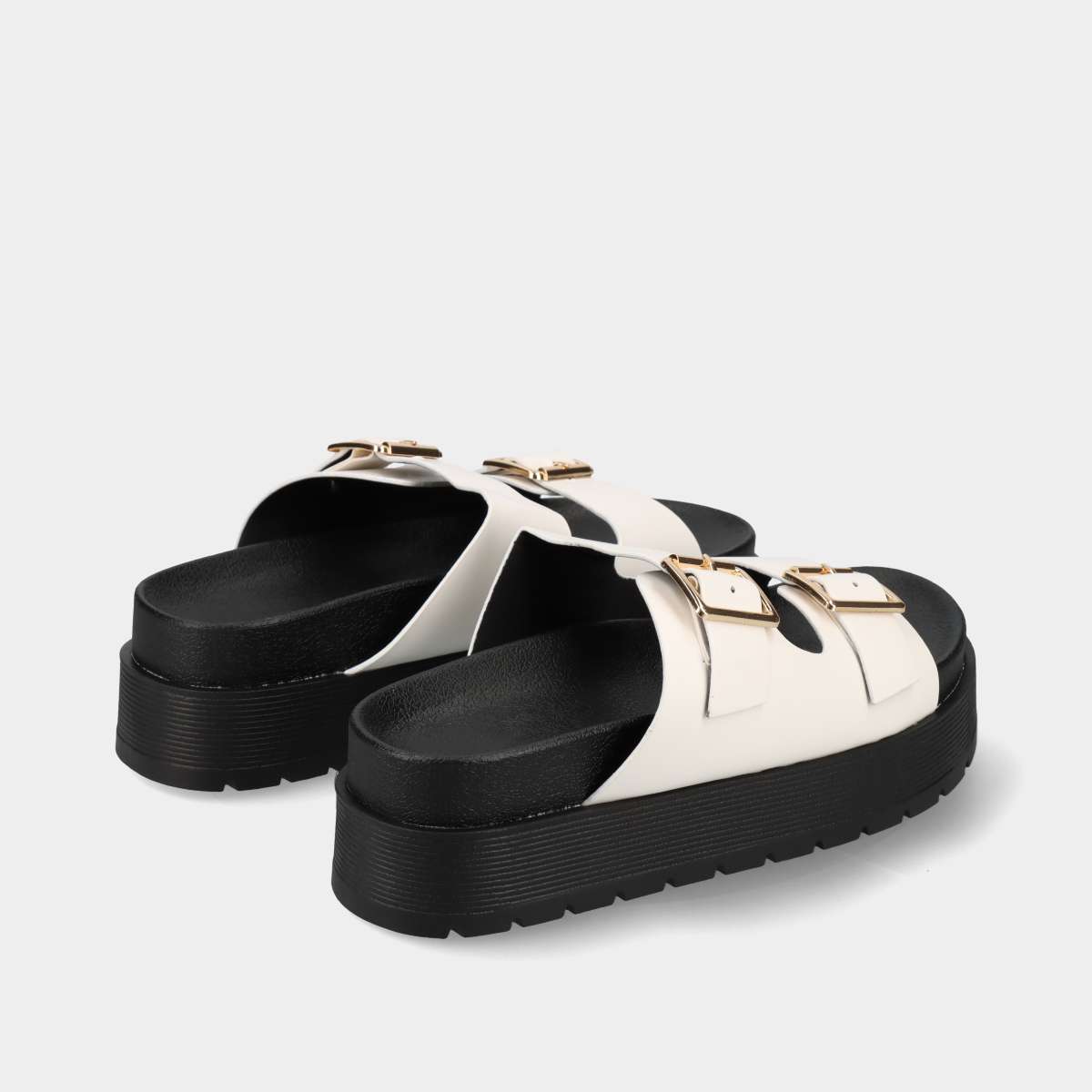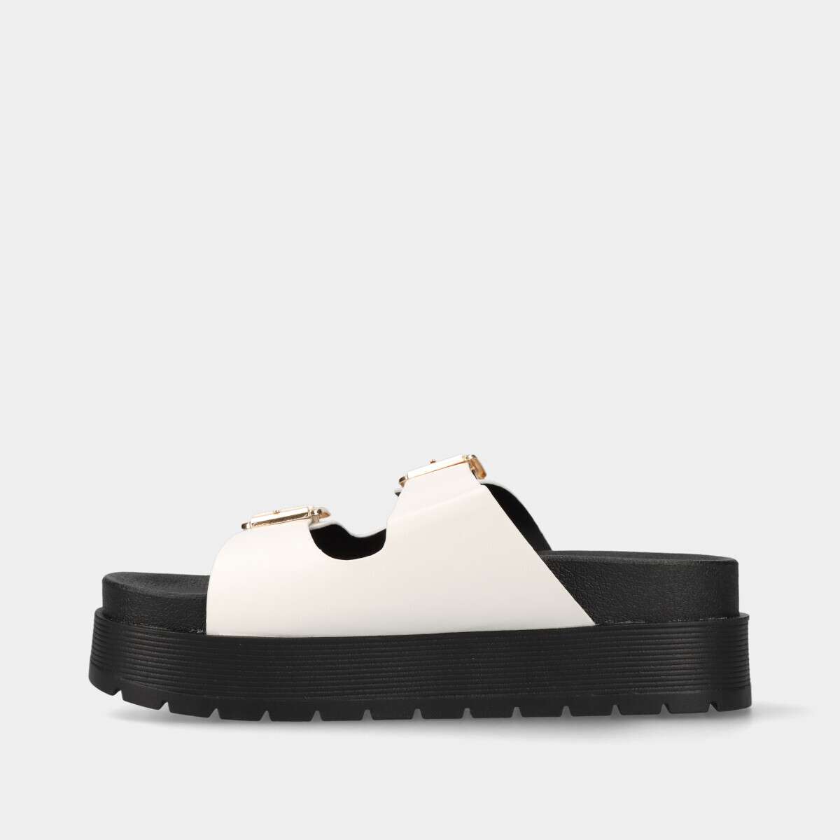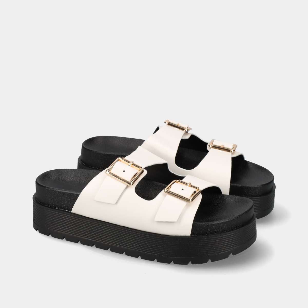 Chinelo anatómico de plataforma para mulher, confortável e moderno, na cor branca com duas fivelas laterais douradas.