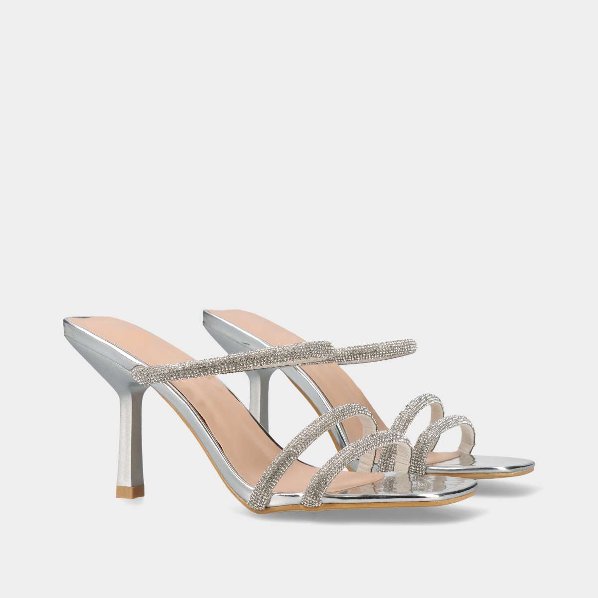 Sandália de salto tipo mule com 9 cm, acabamento prateado metálico e tiras finas com brilhantes. Palmilha almofadada para maior conforto. Ideal para festas, casamentos e cerimónias.