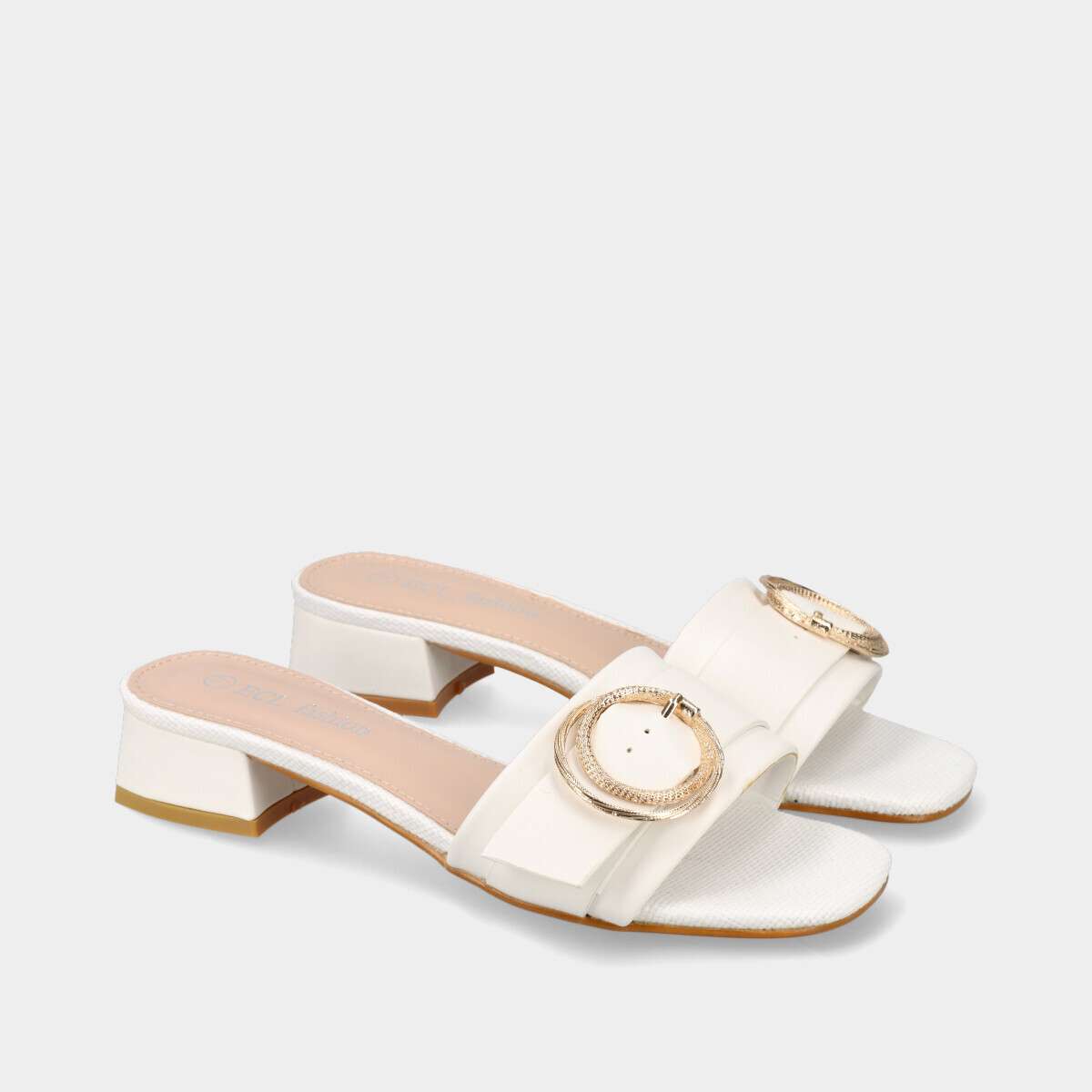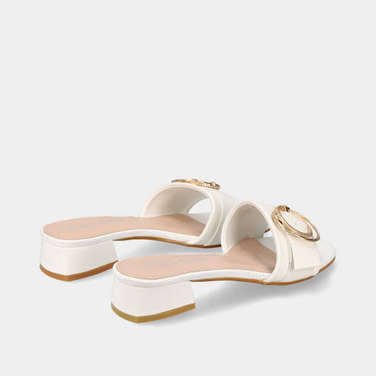 Chinelos brancos de mulher com salto baixo e fivela dourada. Modelo elegante e confortável, ideal para verão e looks casuais chic.