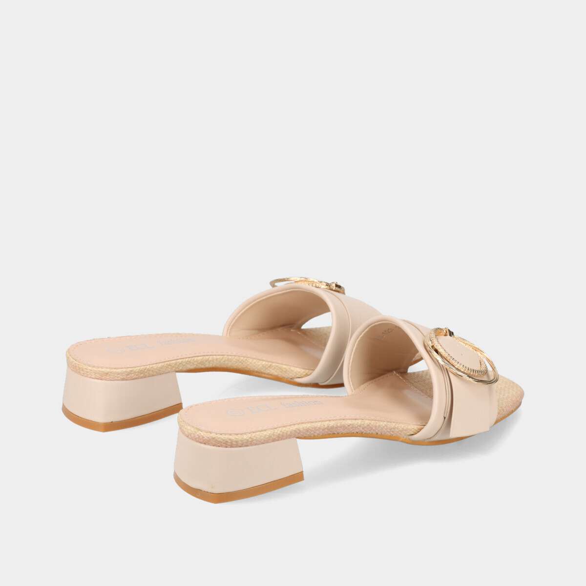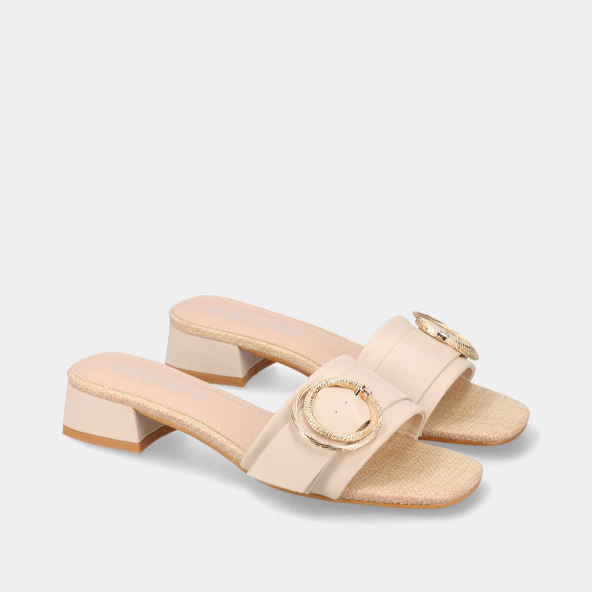 Chinelos bege de mulher com salto baixo e fivela dourada. Modelo elegante e confortável, ideal para verão e looks casuais chic.