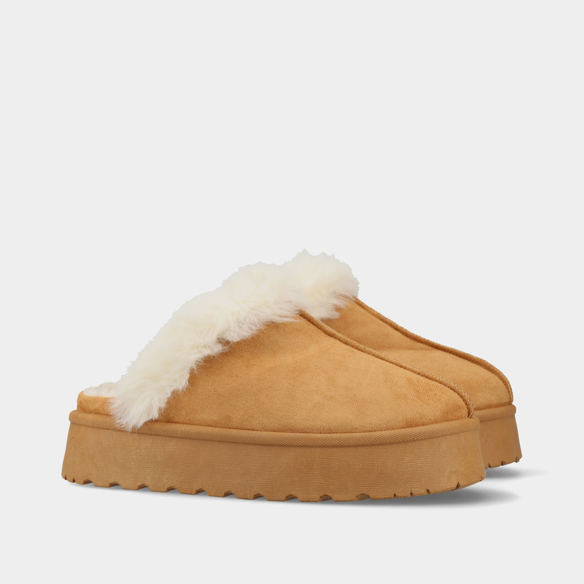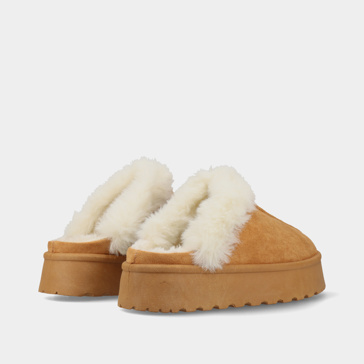 Socas de plataforma para mulher em camel, com forro e gola em pelo quente, ideais para conforto e estilo no outono e inverno.