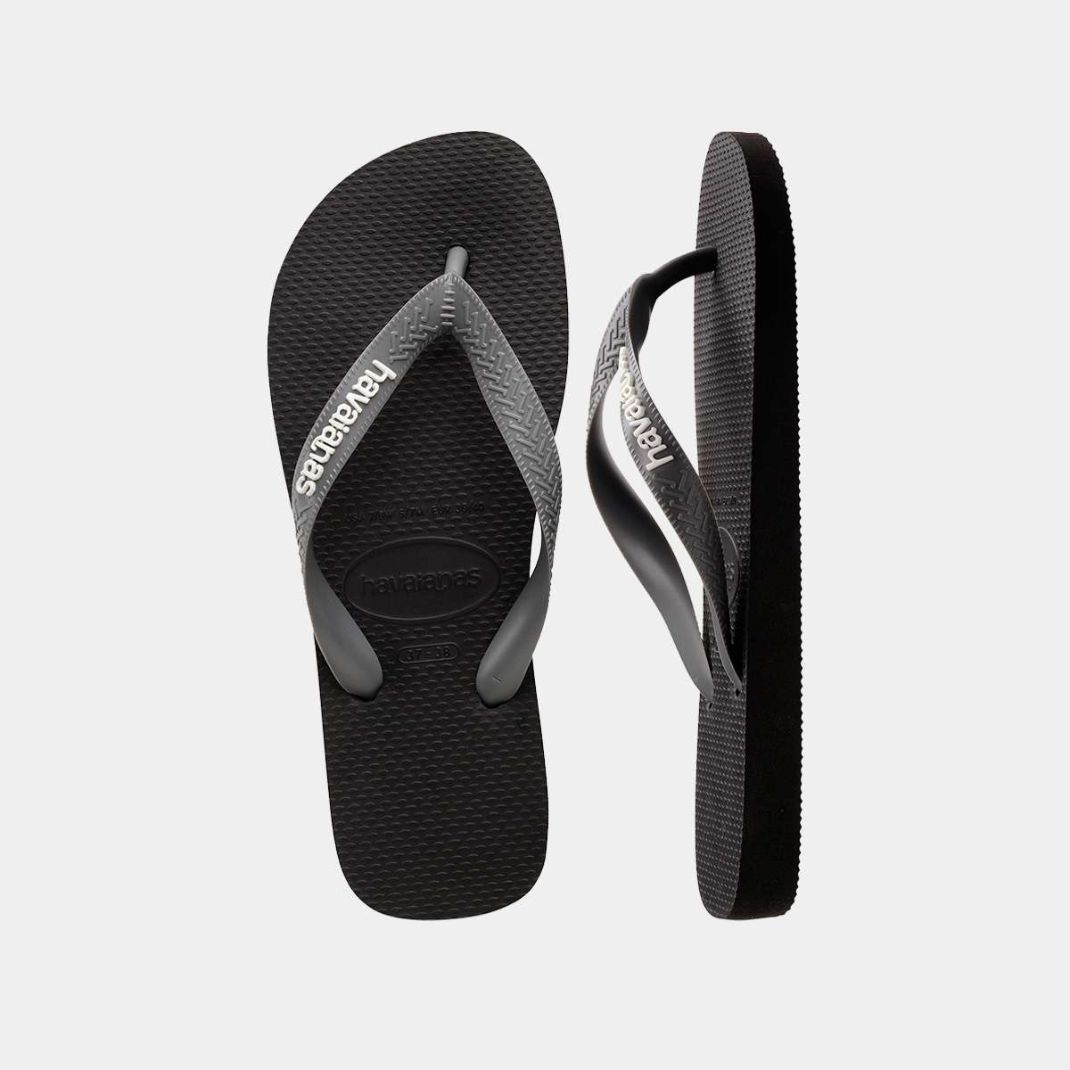 Chinelo preto com tiras cinza, confortável e leve. Design unissexo ideal para o verão.