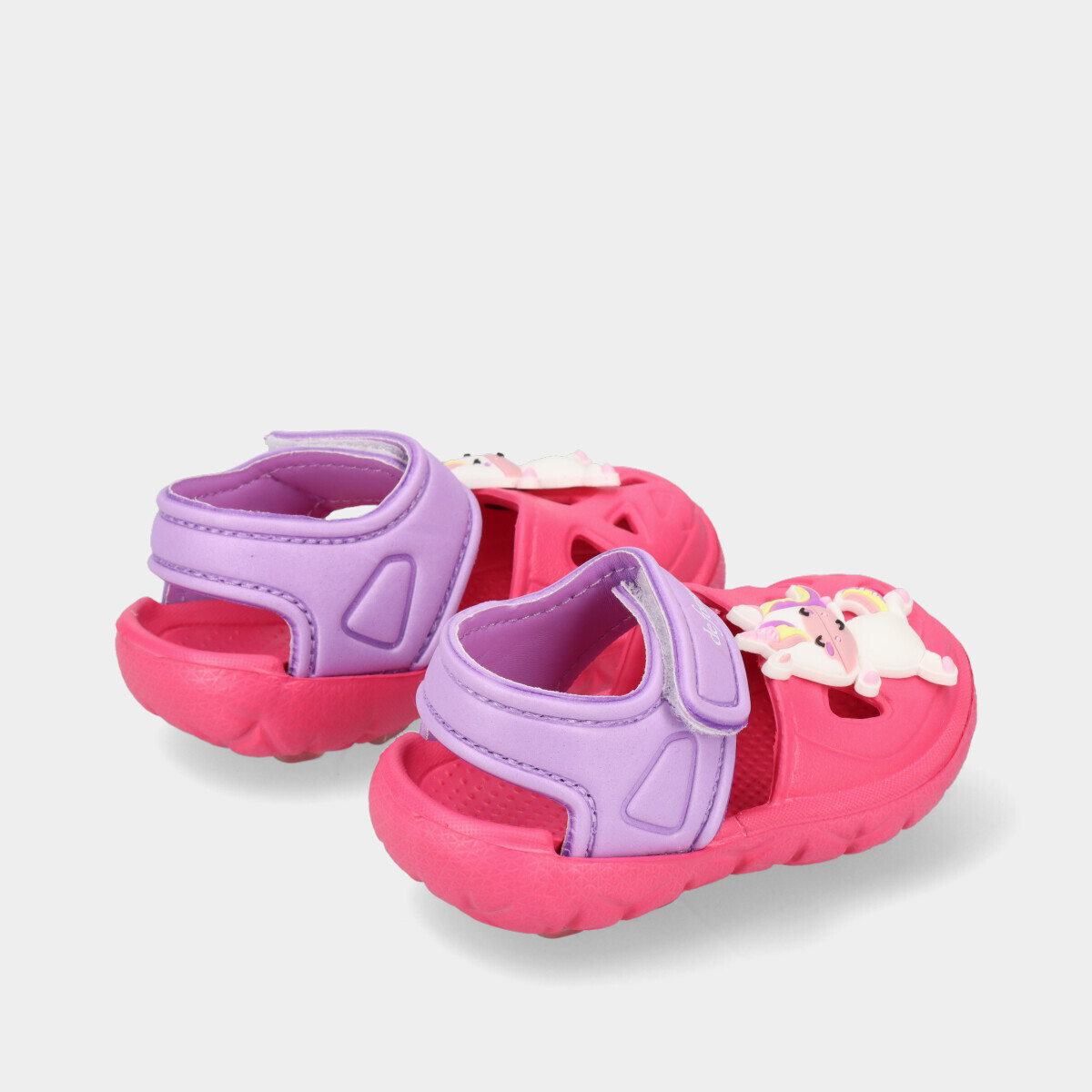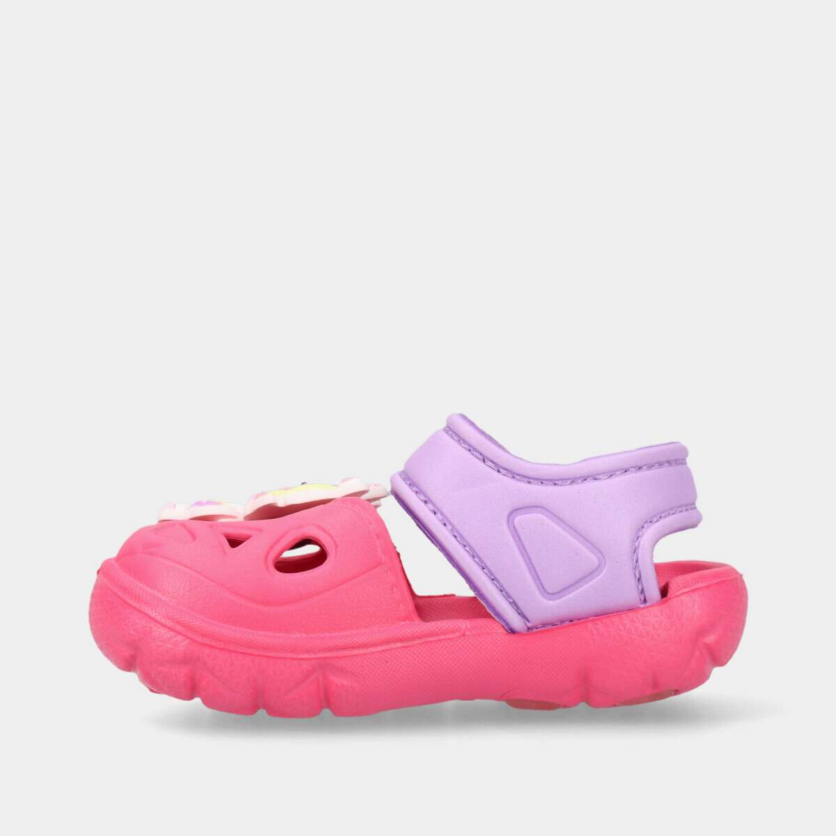 Sandália infantil estilo clogs rosa e lilás para menina, leve e confortável, com aplicação de unicórnio.