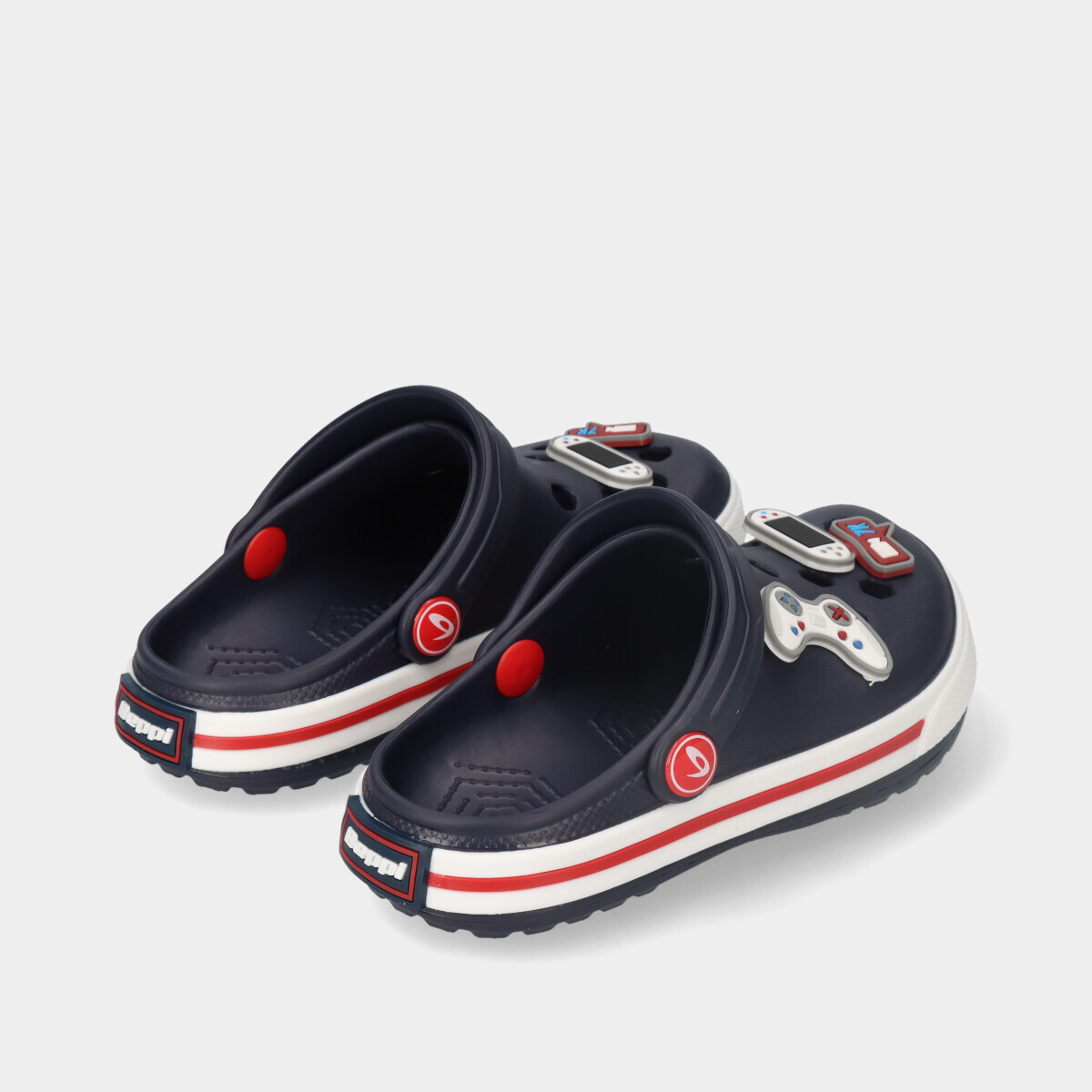 Apresentamos os clogs na vibrante cor azul, um calçado prático e divertido para todas as aventuras. Estes clogs são caracterizados pela sua alça movível, que pode ser ajustada tanto no peito do pé quanto atrás dele, garantindo um ajuste seguro e confortável. Com aplicações divertidas, estes clogs adicionam um toque de diversão e personalidade a qualquer look.