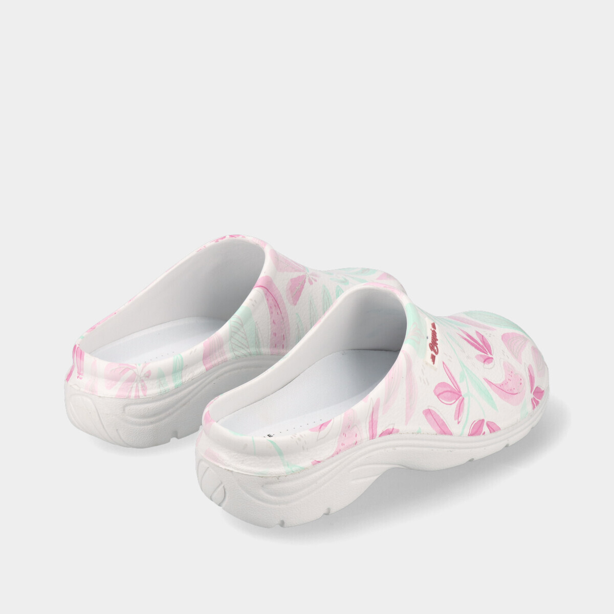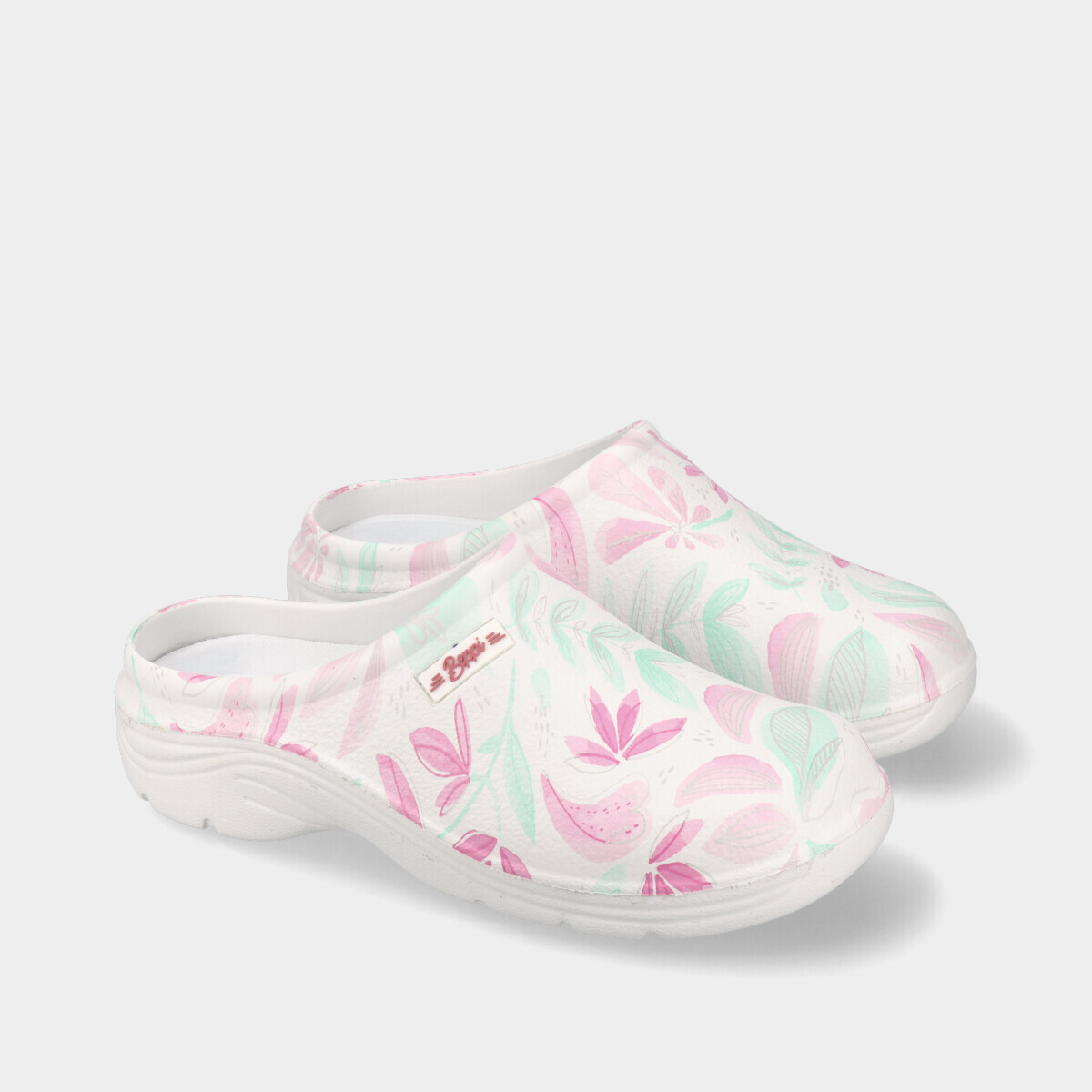 Socas brancas com tema floral, práticas e confortáveis para casa ou trabalho, fabricadas em material facilmente lavável, com palmilha removível para maior comodidade e limpeza simples.