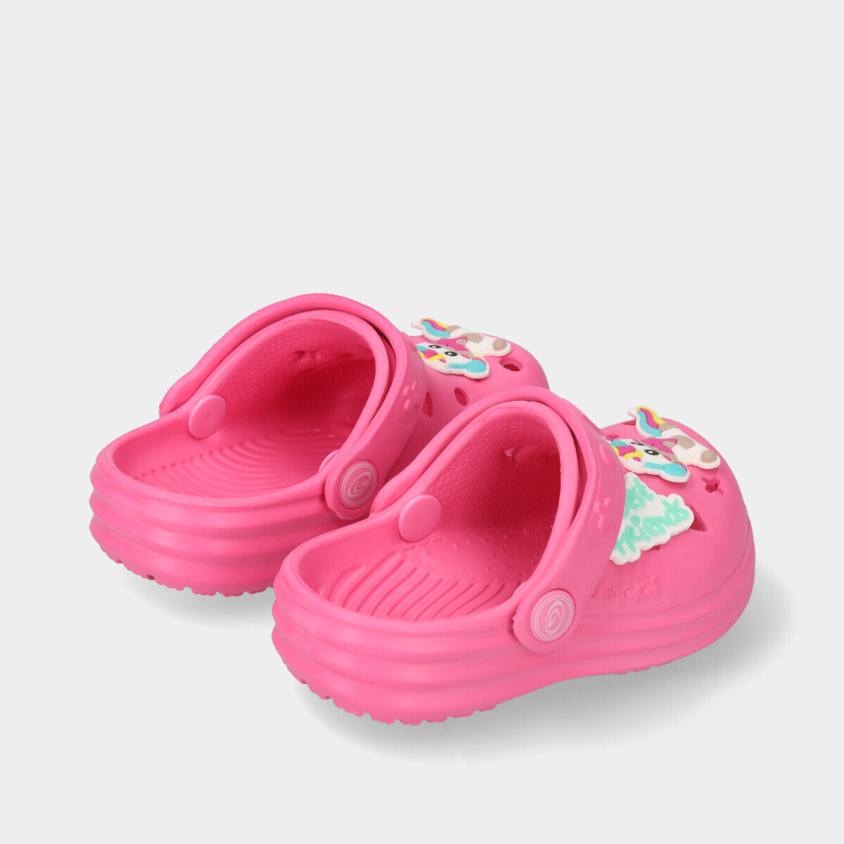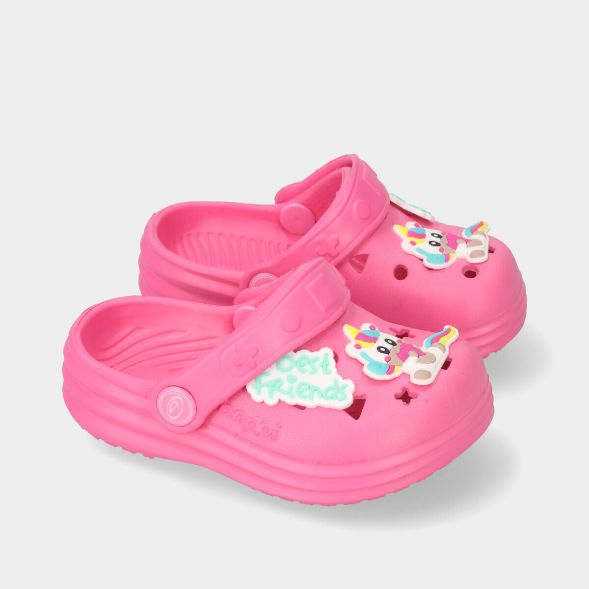 Apresentamos os clogs na vibrante cor rosa, um calçado prático e divertido para todas as aventuras. Estes clogs são caracterizados pela sua alça movível, que pode ser ajustada tanto no peito do pé quanto atrás dele, garantindo um ajuste seguro e confortável. Com uma aplicação divertida de um unicórnio, estes clogs adicionam um toque de diversão e personalidade a qualquer look.