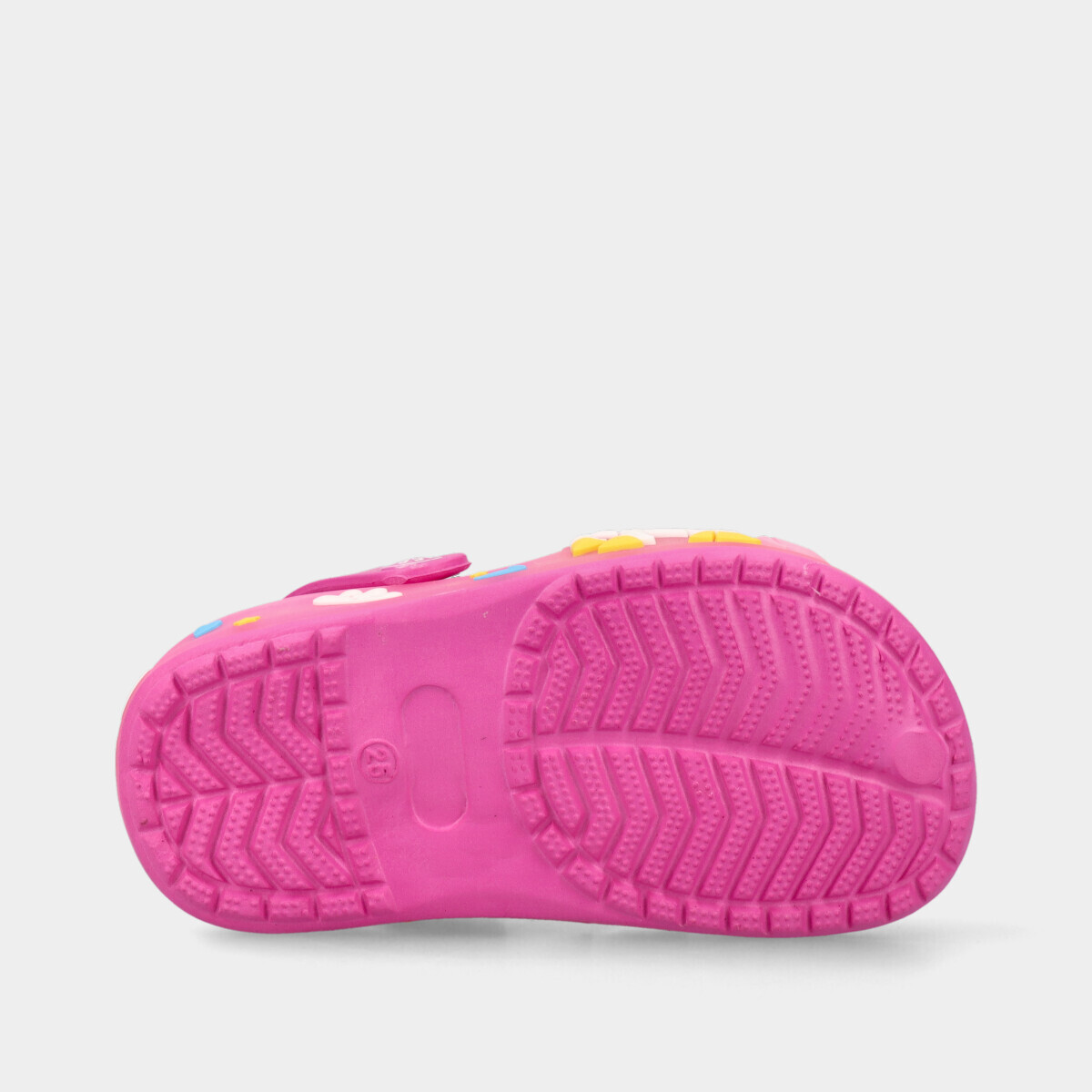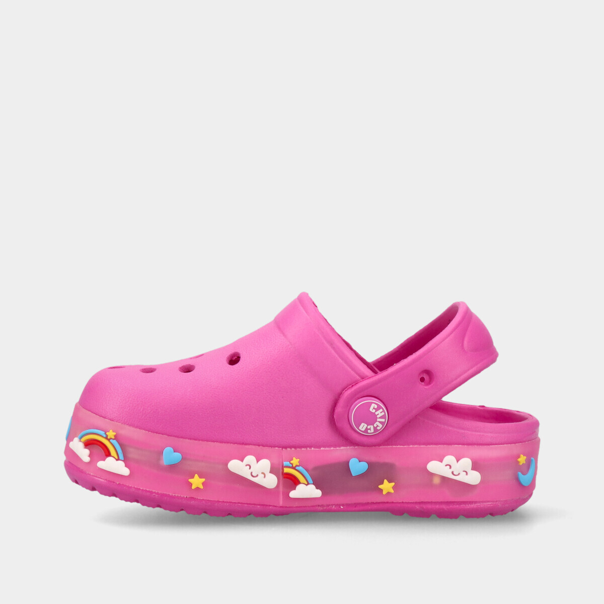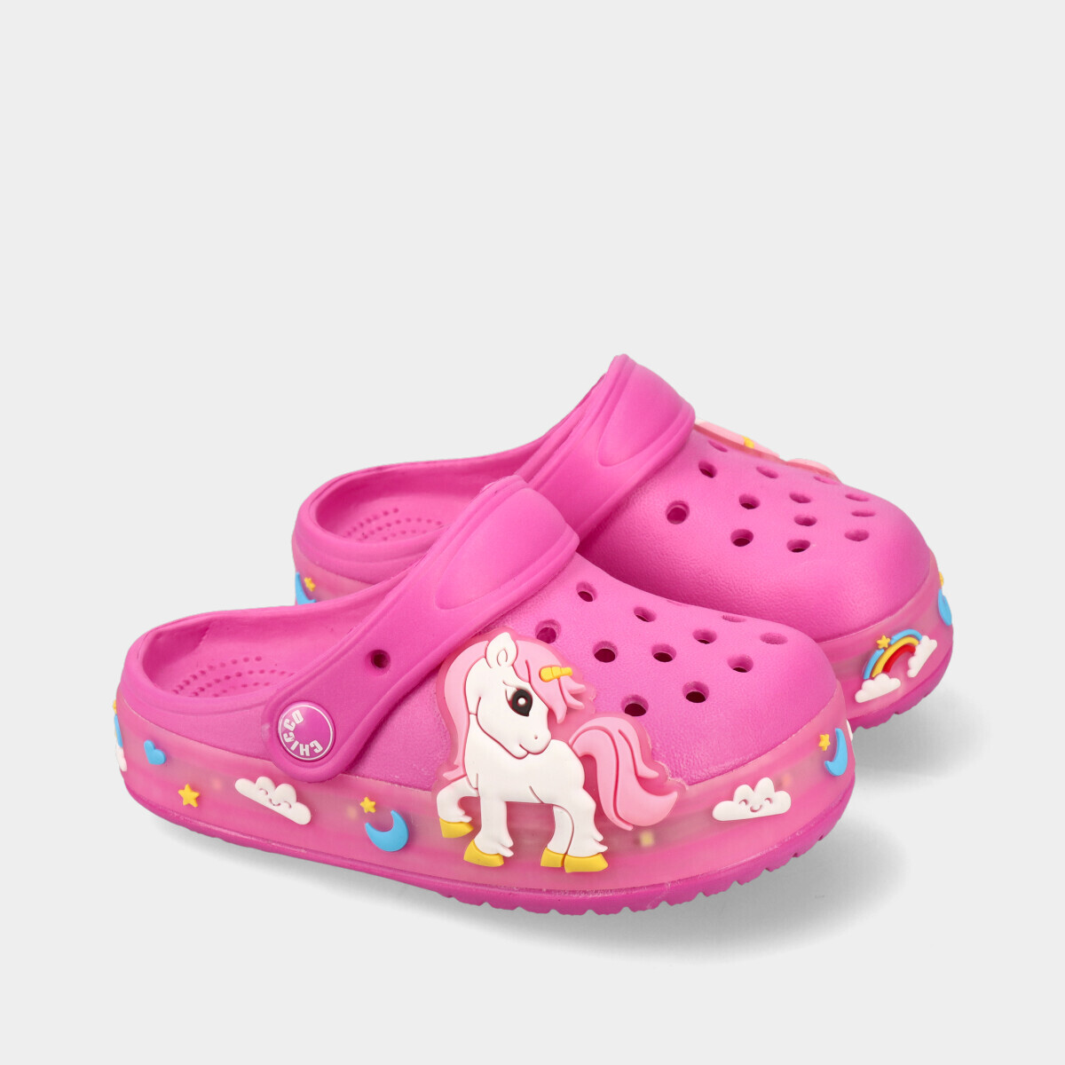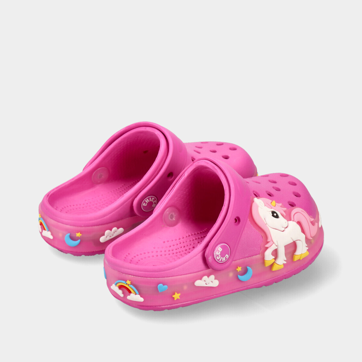 Clogs rosa para menina com luzes coloridas na sola e tema unicórnio, leves, confortáveis e ideais para o verão. Perfeitos para praia, piscina e uso diário, estes clogs de criança garantem praticidade e conforto nos dias quentes.