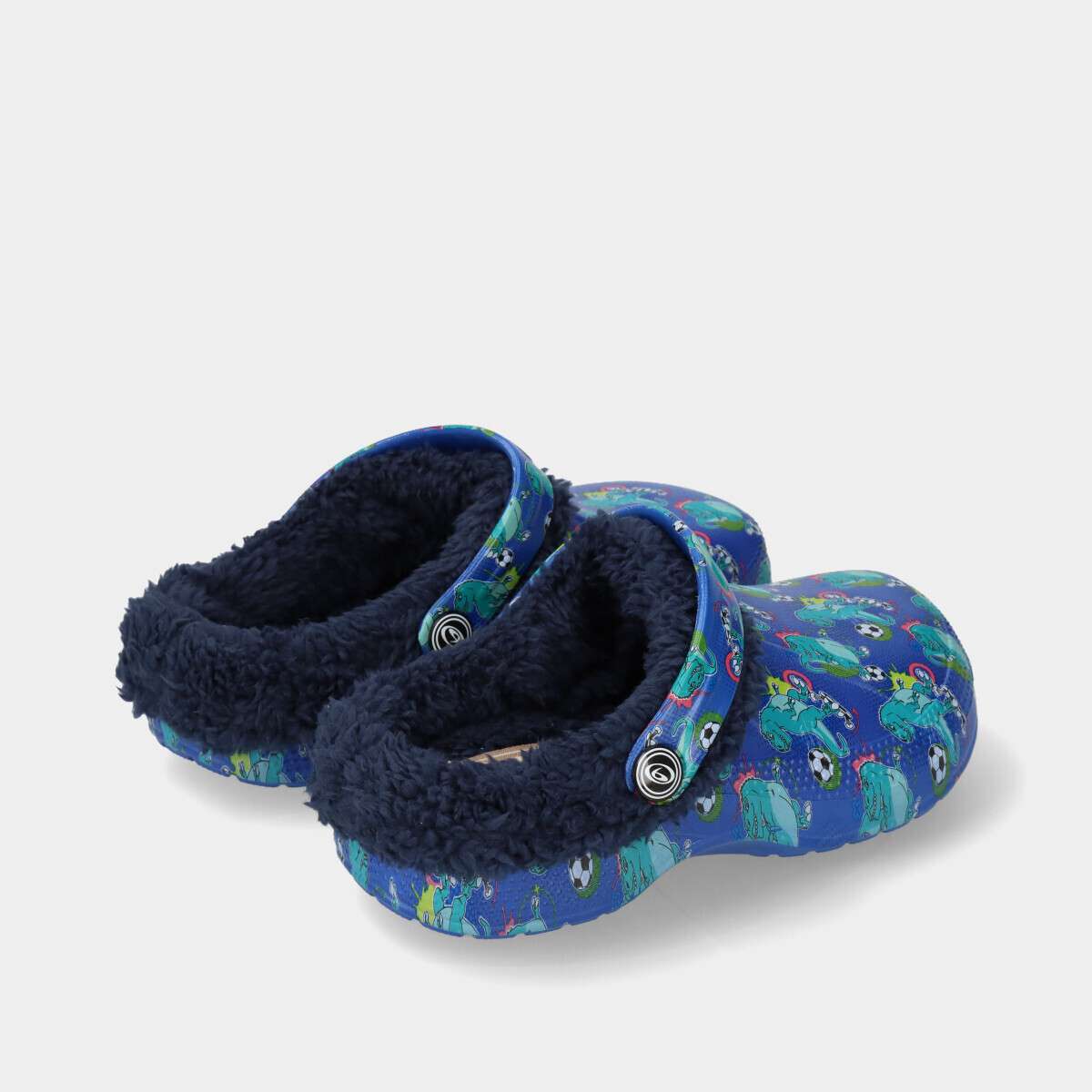 Clogs na cor azul com tema de dinossauro e bola, pelo no interior e alça movível.