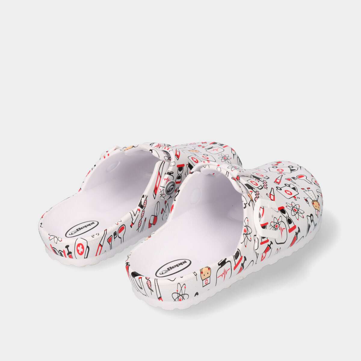 Clogs na cor branca com tema hospitalar e fivela no peito do pé para ajustar.