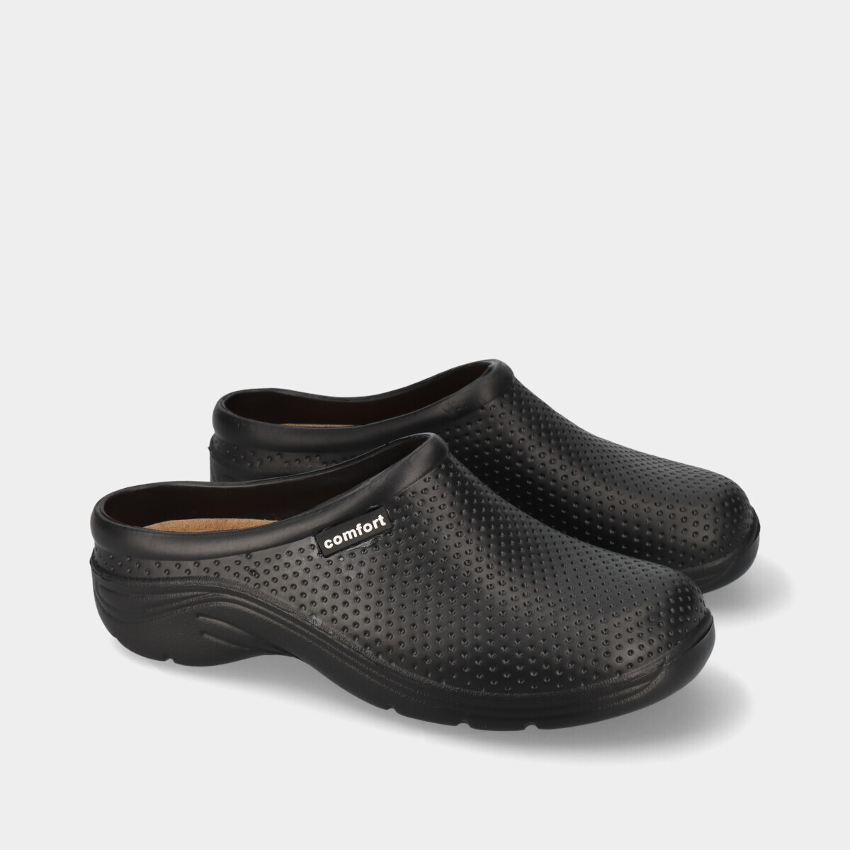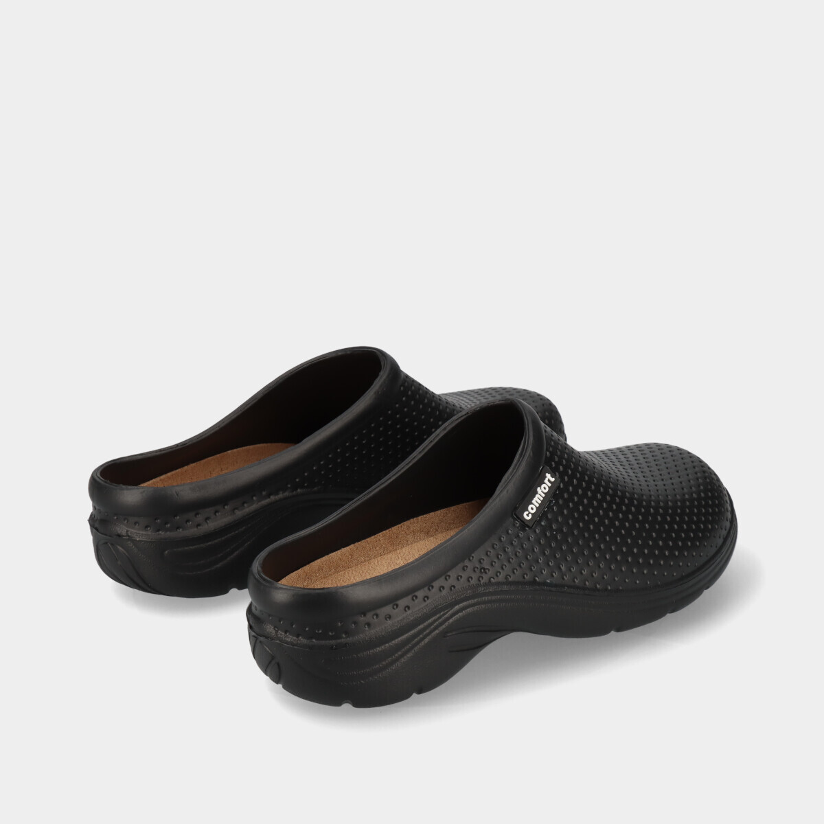 Socas pretas práticas e confortáveis para casa ou trabalho, fabricadas em material facilmente lavável, com palmilha removível para maior comodidade e limpeza simples.